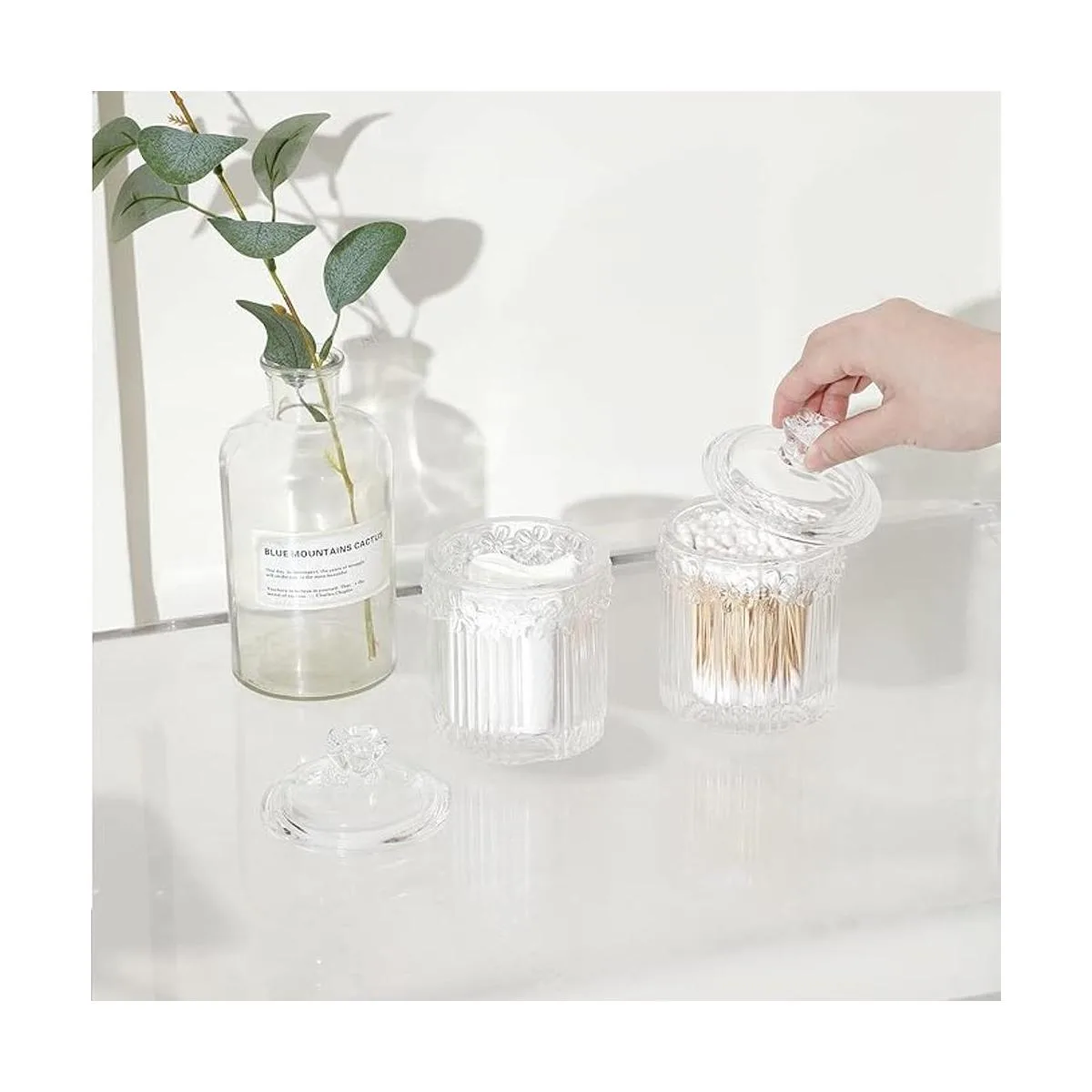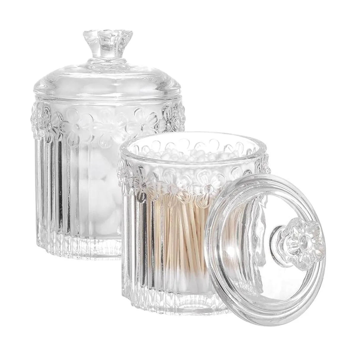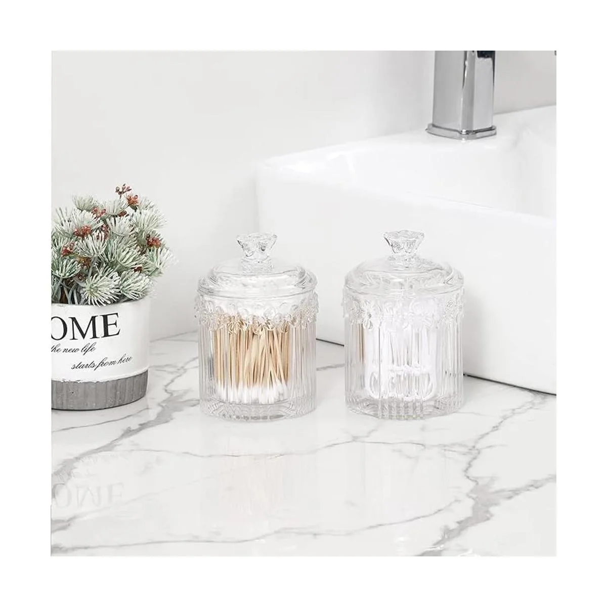 rejomiik Qtip Tarros de boticario de vidrio con tapa, accesorios de baño, organizadores de tocador y almacenamiento de maquillaje para bola de algodón, paquete de 2 unidades transparente
