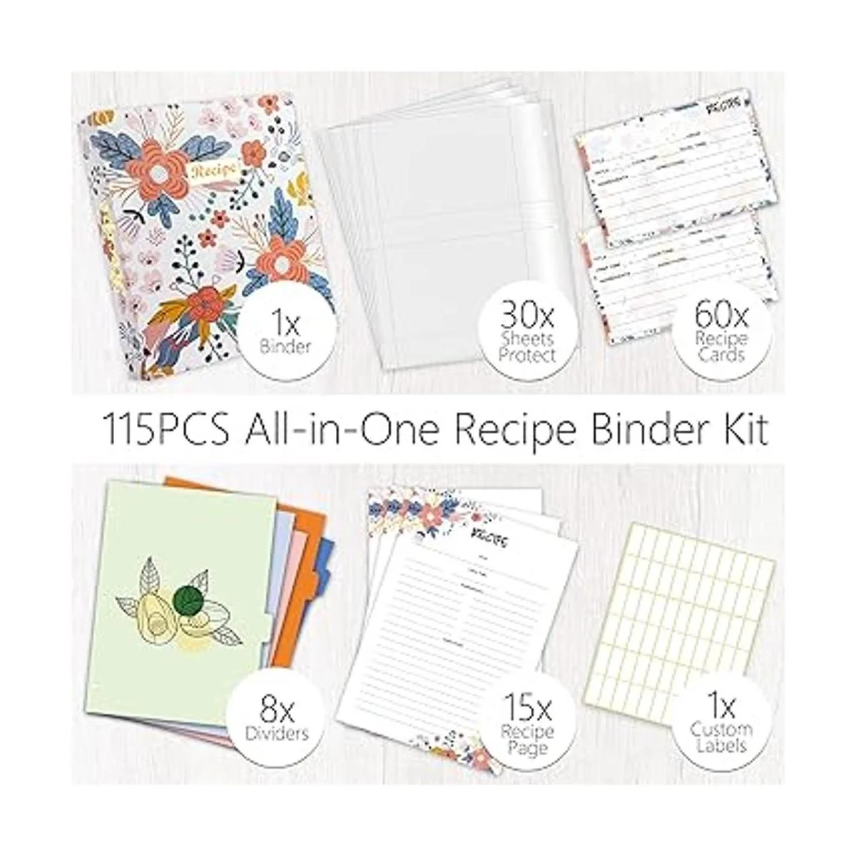 115 cuadernos de recetas en blanco: 1 carpeta grande de 3 anillos de 8.5 x 11 pulgadas mide 12 x 11 x 2 pulgadas. Con 60 tarjetas de recetas de 4 x 6 pulgadas, 8 separadores con diferentes temas de cocina, 30 fundas protectoras, 1 página de etiquetas 66 piezas, 15 páginas de recetas completas adicionales para platos de vacaciones, etc. Un juego completo de libros de recetas para comenzar tu maravilloso diario de comida