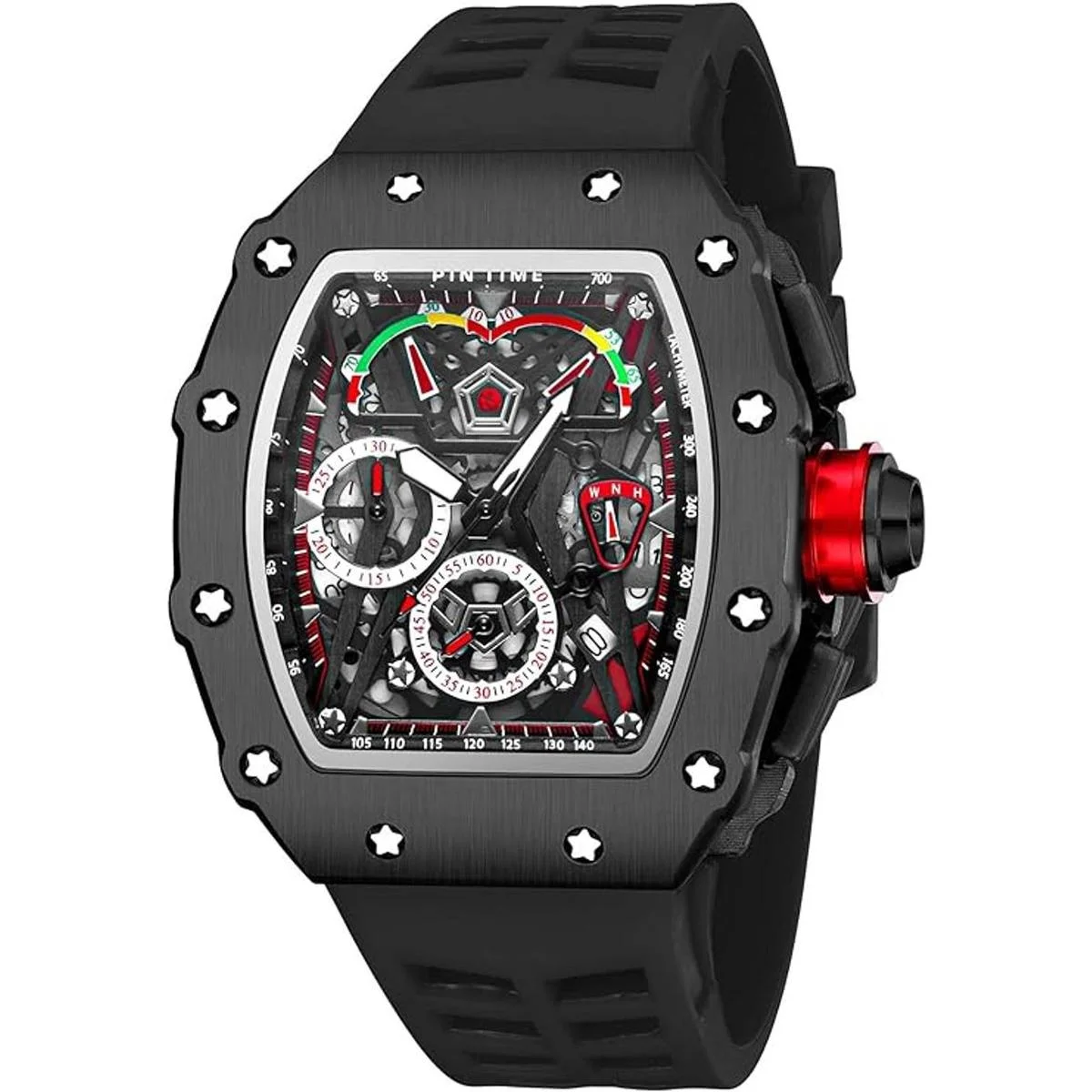 Relojes de esqueleto para hombre: El diseño en forma de barril del reloj se basa en la geometría del arco que se adapta mejor a la muñeca y es más cómodo cuando se utiliza. La esfera de esqueleto permite ver directamente el exquisito diseño del interior del reloj. La corona se asemeja a la rueda de un automóvil deportivo.