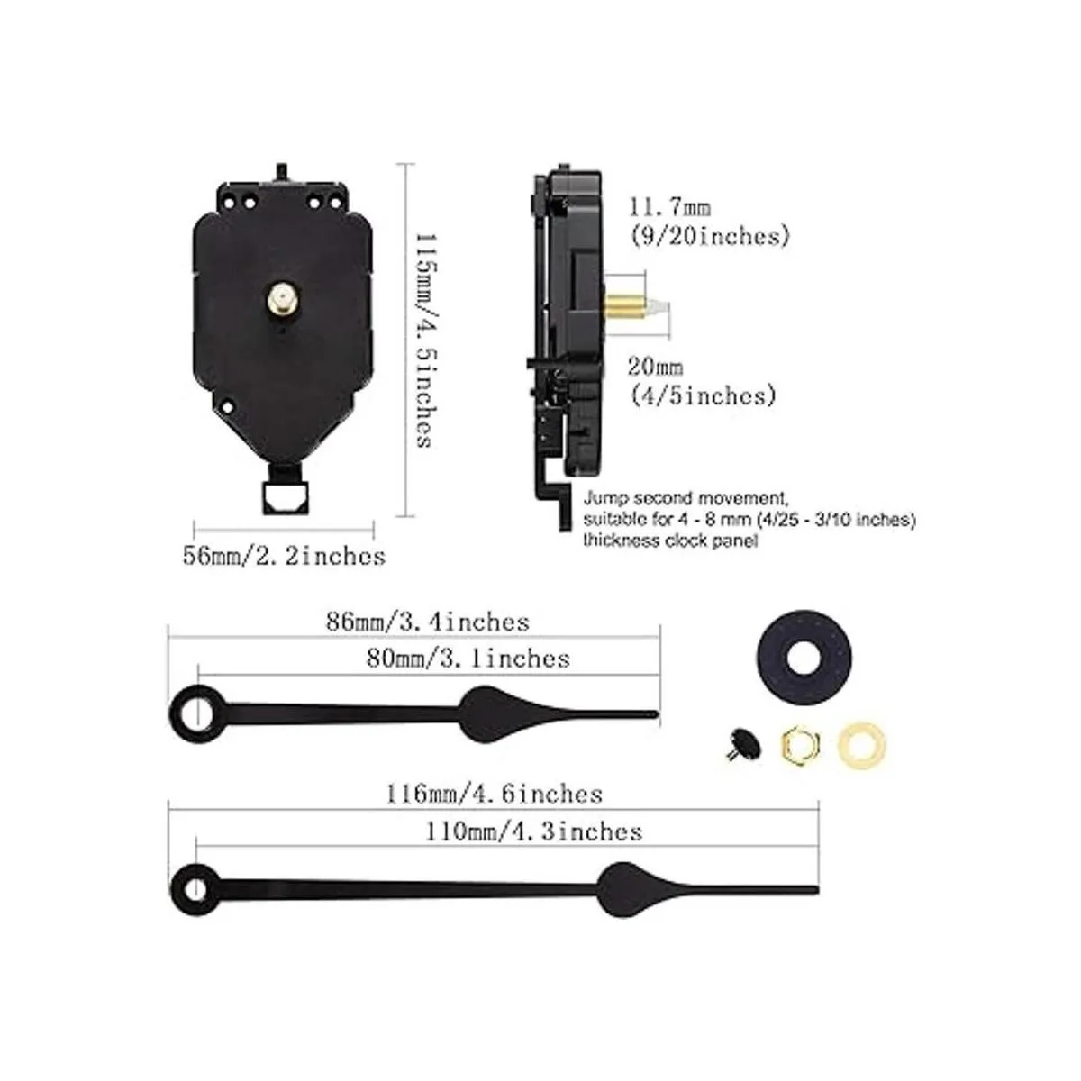 Tamaño del mecanismo del reloj: la longitud total del eje es de 0.787 in, la longitud de la rosca es de 0.461 in; segundo movimiento, adecuado para paneles de reloj de 4 a 0.315 in de grosor