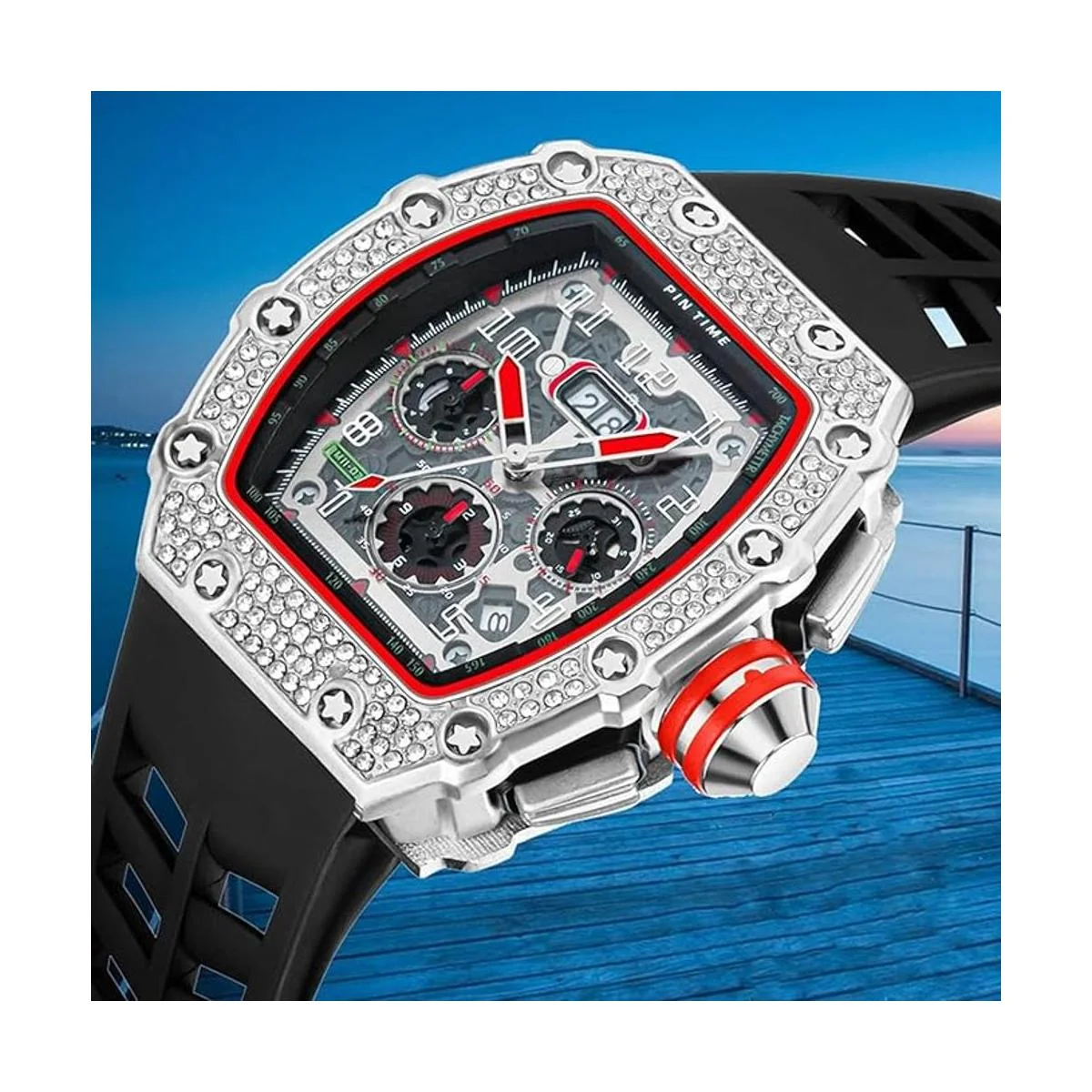 Características del reloj: cronógrafo funcional, manecillas de minutos y hora con pintura roja, marcadores de números arábigos, cristal brillante y bisel decorado con estrellas, lo que lo convierte en el reloj más lujoso para hombres.