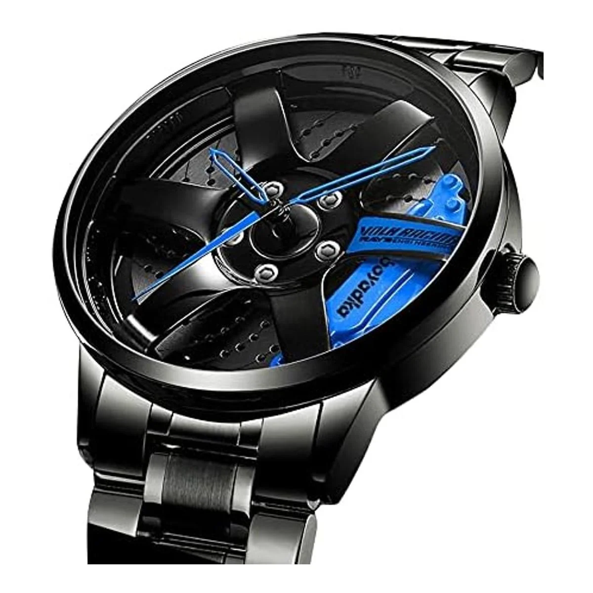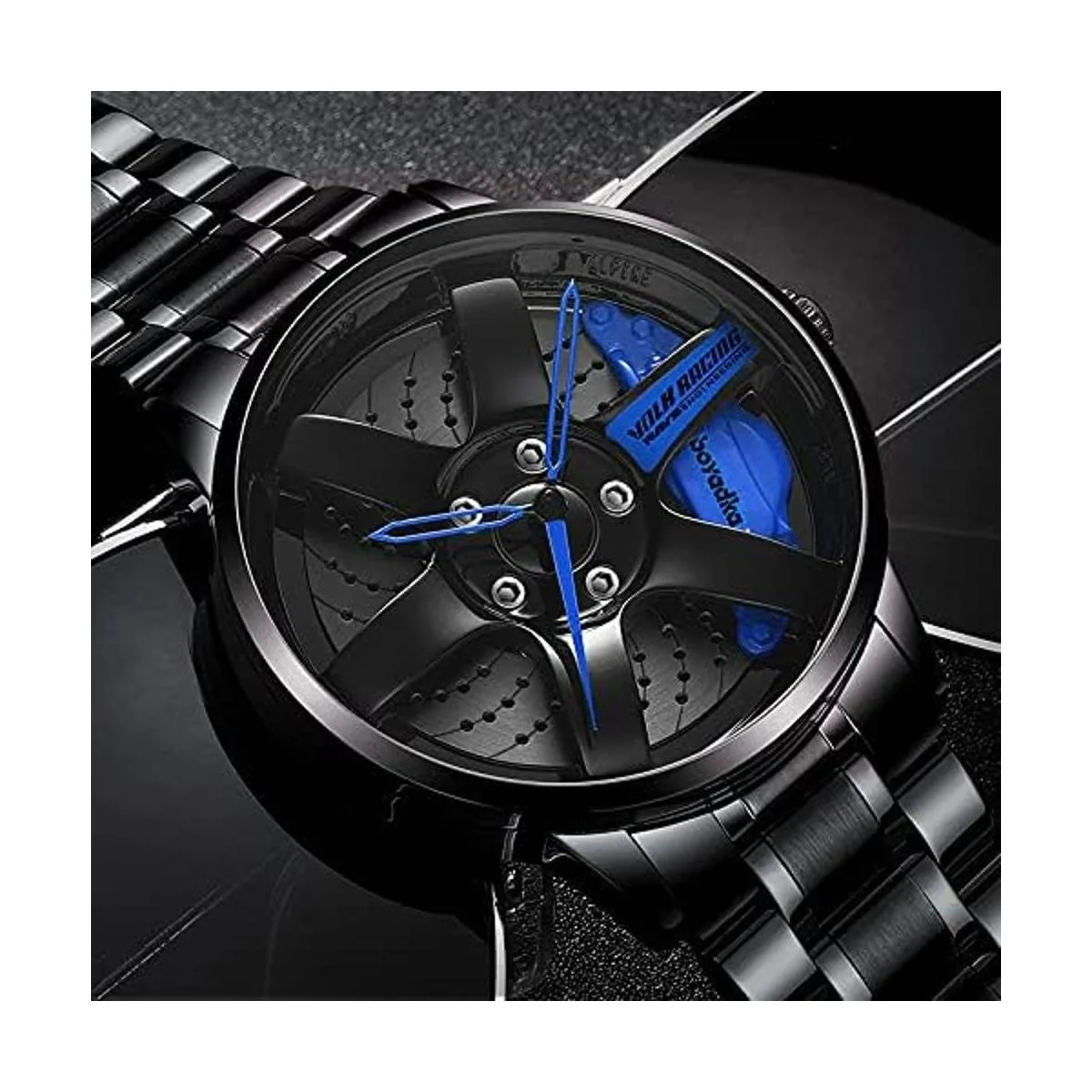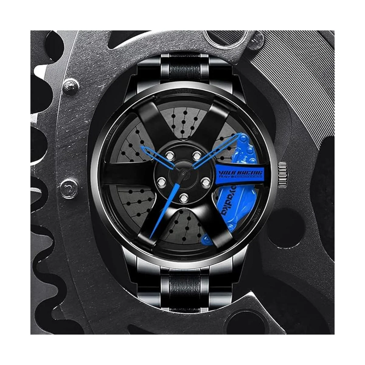 Reloj de rueda de automóvil, reloj de acero inoxidable con movimiento de cuarzo japonés, reloj deportivo impermeable con diseño de cubo de llanta de automóvil para hombresentusiastas del automóvil