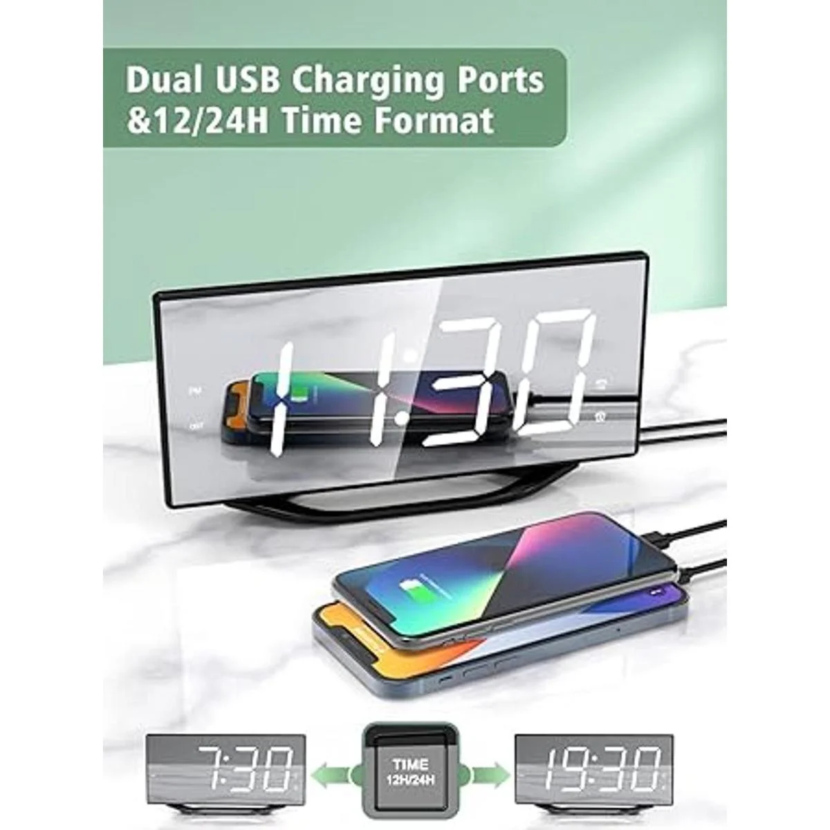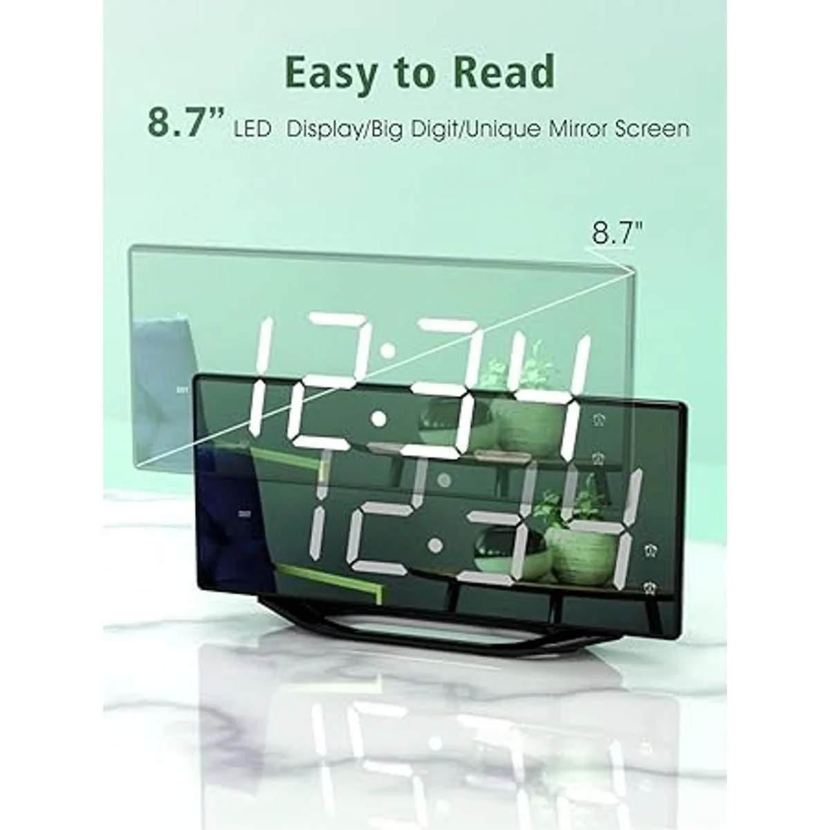 Reloj despertador de pantalla LED grande de 8.7 pulgadas con batería de respaldo para dormitorio, 2 puertos de carga USB, doble configuración de alarma, fácil de usar, atenuador y volumen ajustables, reloj despertador de espejo fuerte para niños que duermen pesados