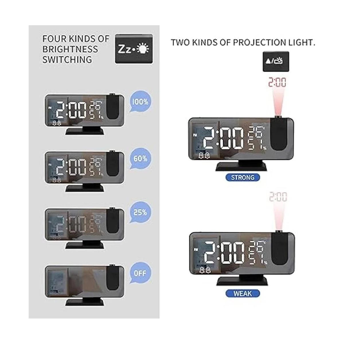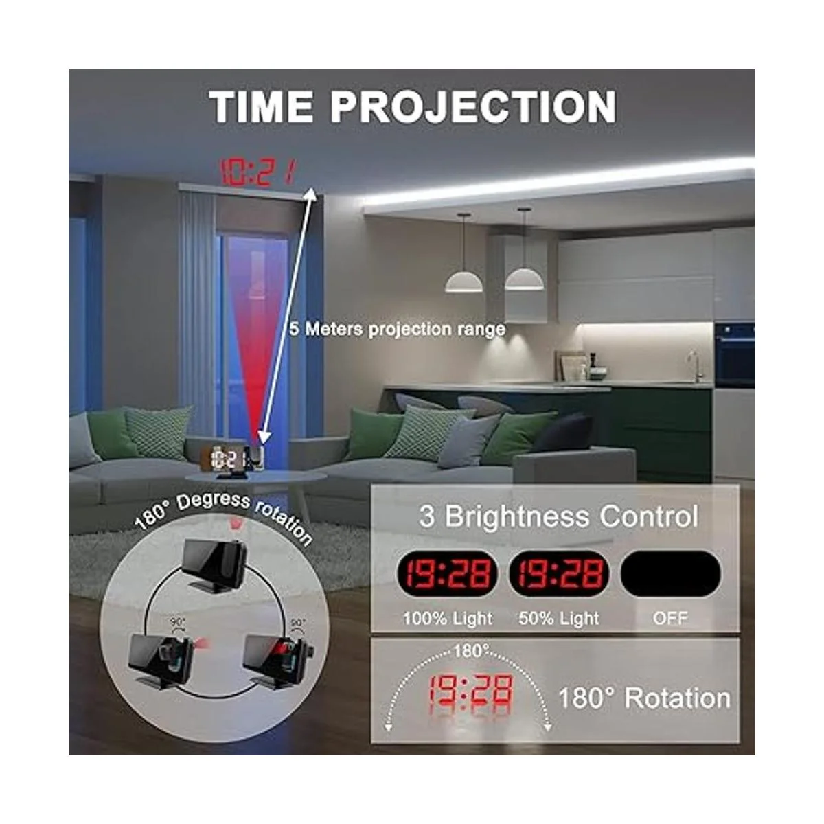 Reloj despertador digital de proyección para dormitorios, reloj despertador de radio en el techo, puerto de cargador USB, pantalla de temperatura y humedad, pantalla LED de espejo grande de 7.3 pulgadas, 1224 horas, repetición, reloj despertador doble ruidoso, 4 reguladores