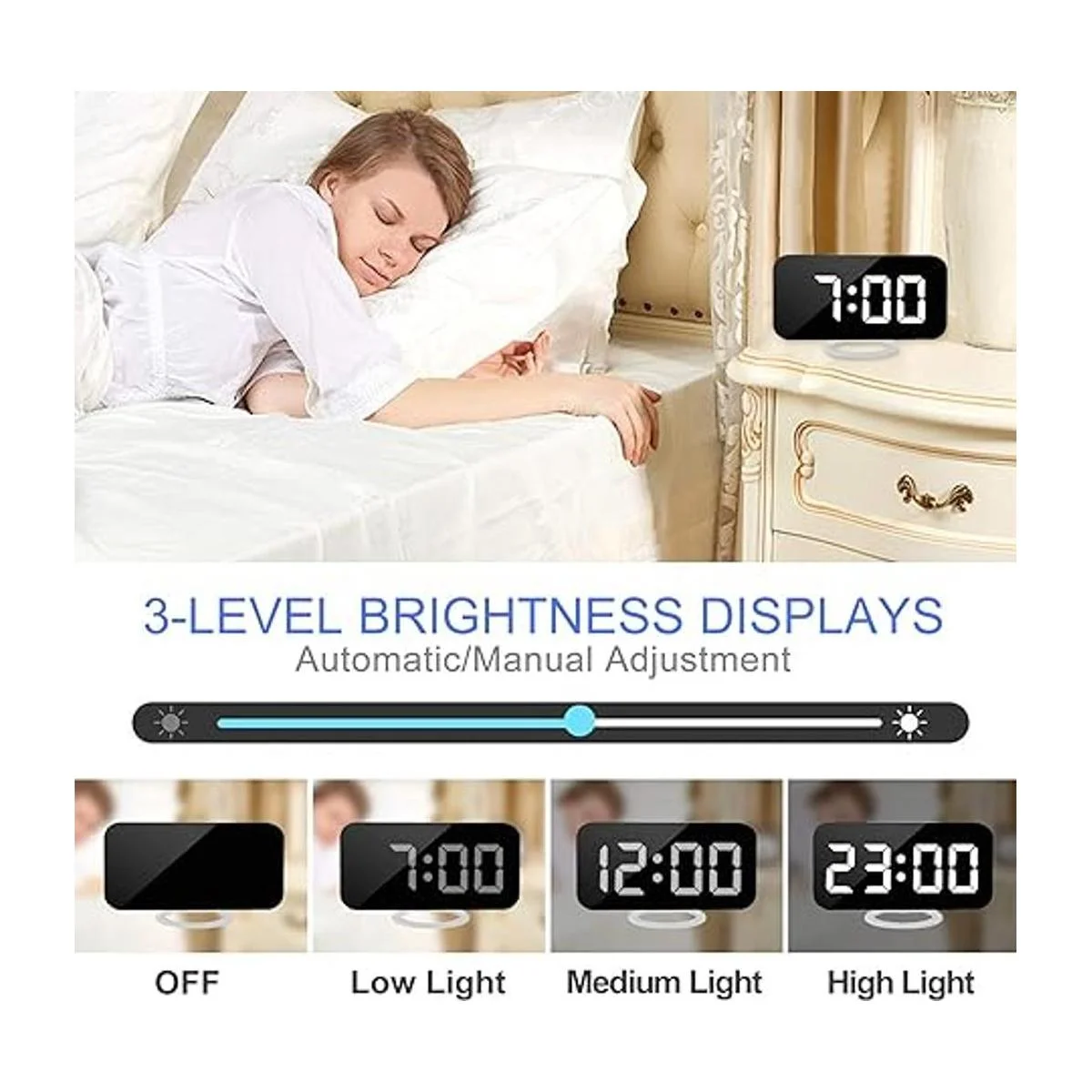 Brillo de 3 niveles ajuste automático: la pantalla de visualización LED del reloj electrónico tiene tres tipos de brillo: luz baja, media y alta, puedes elegir el brillo que desees; el reloj LED está equipado con un sensor fotosensible que ajusta automáticamente su brillo en función de la intensidad de la luz alrededor de la pantalla.