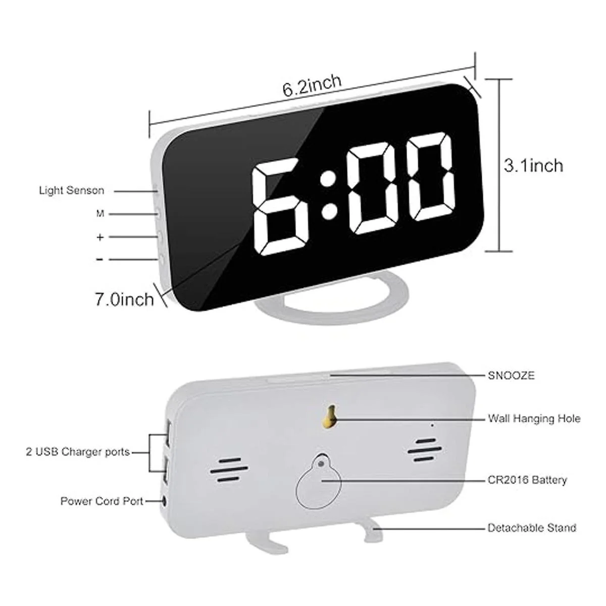 Dos puertos de carga USB memoria de apagado: el reloj espejo utiliza la fuente de alimentación USB DC5V/1A, con 2 puertos USB, que puede cargar tu teléfono móvil, tableta; el reloj moderno está equipado con la batería CR2016. Aunque la alarma esté desconectada o la fuente de alimentación USB, puedes seguir manteniendo los datos de la alarma.