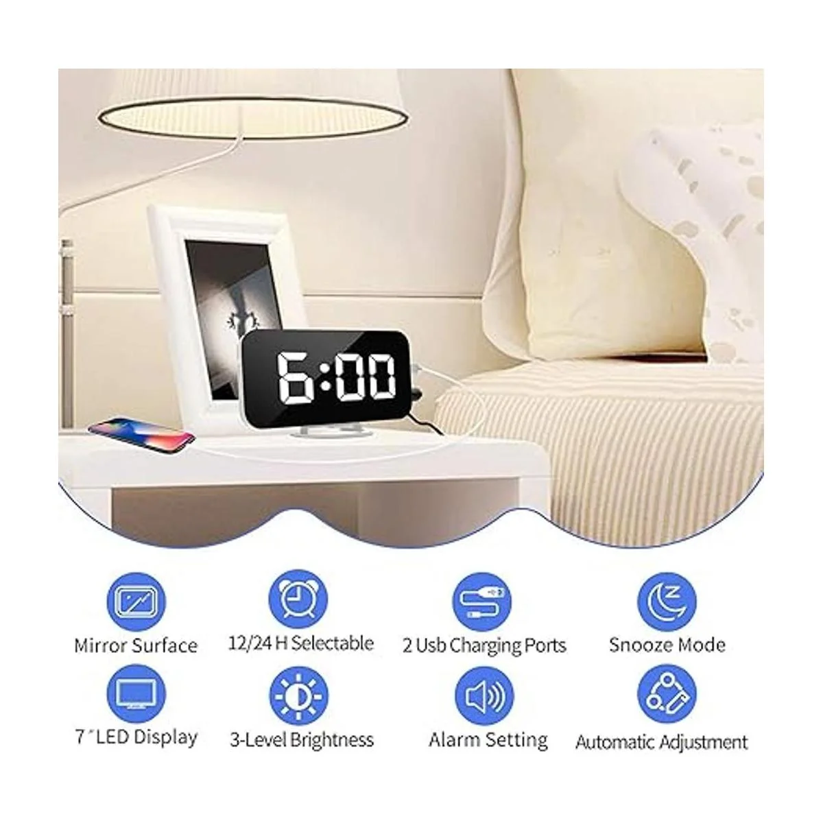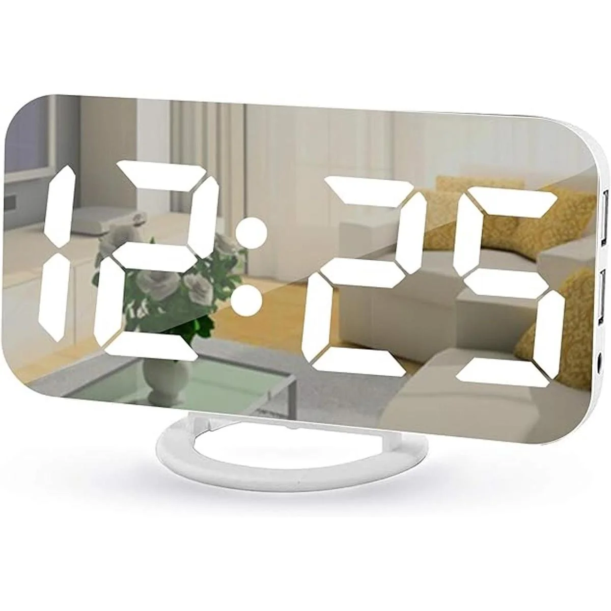Reloj despertador digital, relojes electrónicos con espejo LED de 7 pulgadas, con 2 puertos de carga USB, modo de suspensión, ajuste automático de brillo, relojes de pared y de escritorio modernos para dormitorios, sala de estar y oficina, color blanco