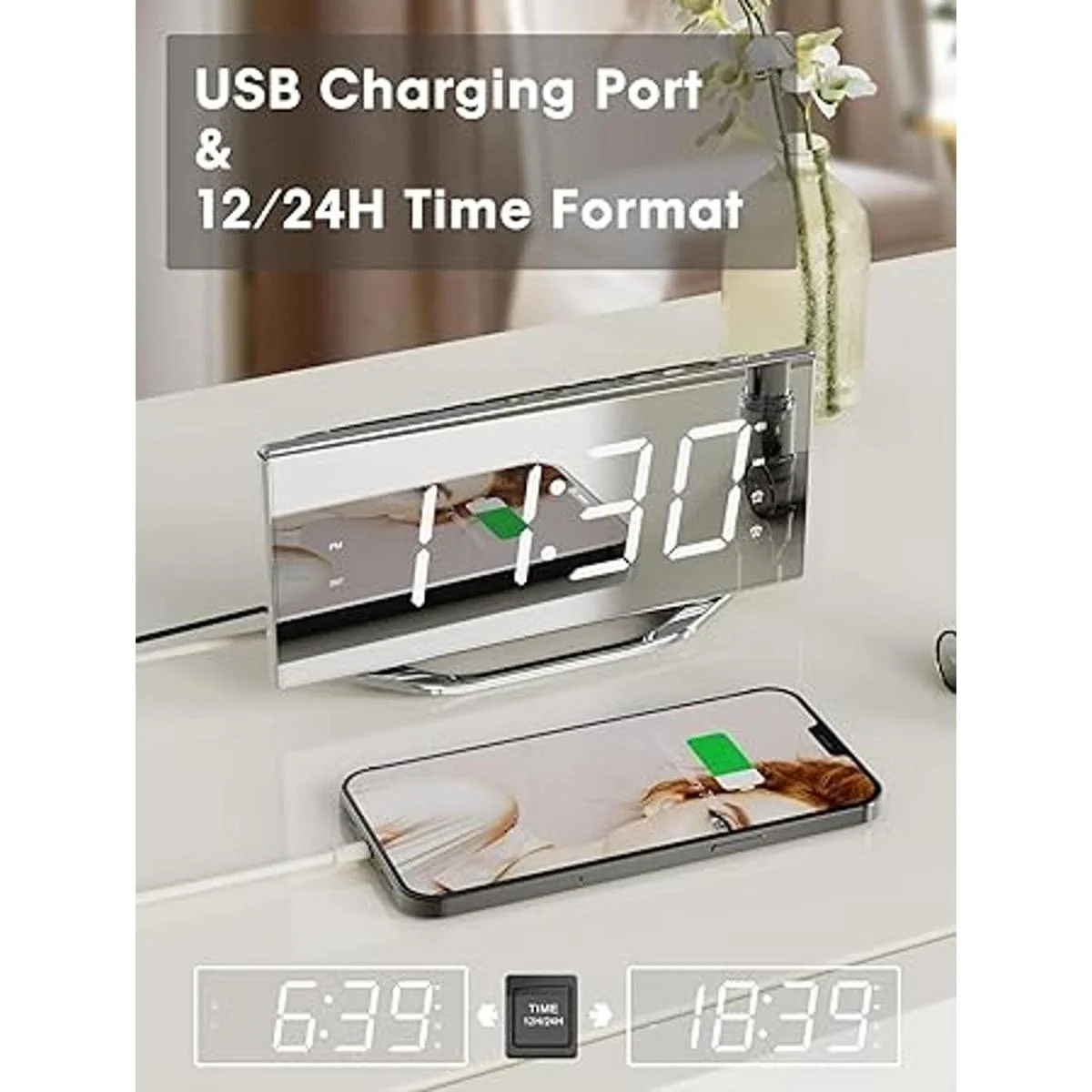 Reloj de batería de respaldo con puerto de carga USB: nuestro reloj despertador para niños equipa un puerto de carga USB, es conveniente cargar tu teléfono y otros dispositivos sin enchufarlo al enchufe. Este sencillo reloj ocupa muy poco espacio y combina bien con los otros artículos de tu mesa. Nuestro reloj de espejo solo se puede utilizar cuando está conectado a la fuente de alimentación a través del cable de alimentación. Cuando ocurre un corte de energía, la batería de moneda de celda CR2032 de respaldo incluida almacenará los ajustes de hora y reloj.