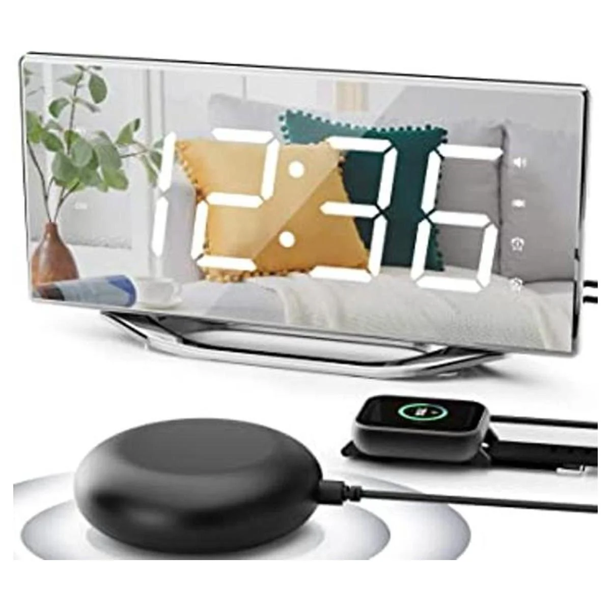 Reloj despertador doble con agitador de cama para adultos que duermen pesadamente con discapacidad auditiva, reloj LED digital con espejo grande, enchufe fuerte, para dormitorio con cargador de teléfono, 8 reguladores, 7 volúmenes, hogar, adolescente, niño y niña