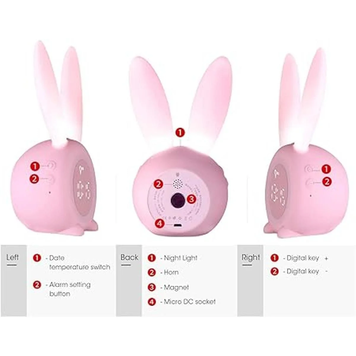 Diseño multifuncional: el bonito reloj despertador de conejo no solo tiene luces coloridas suaves, sino que también tiene una función de repetición, que se puede activar agitando el reloj despertador rápidamente. Al mismo tiempo, también tiene termómetro y función de visualización de fecha.