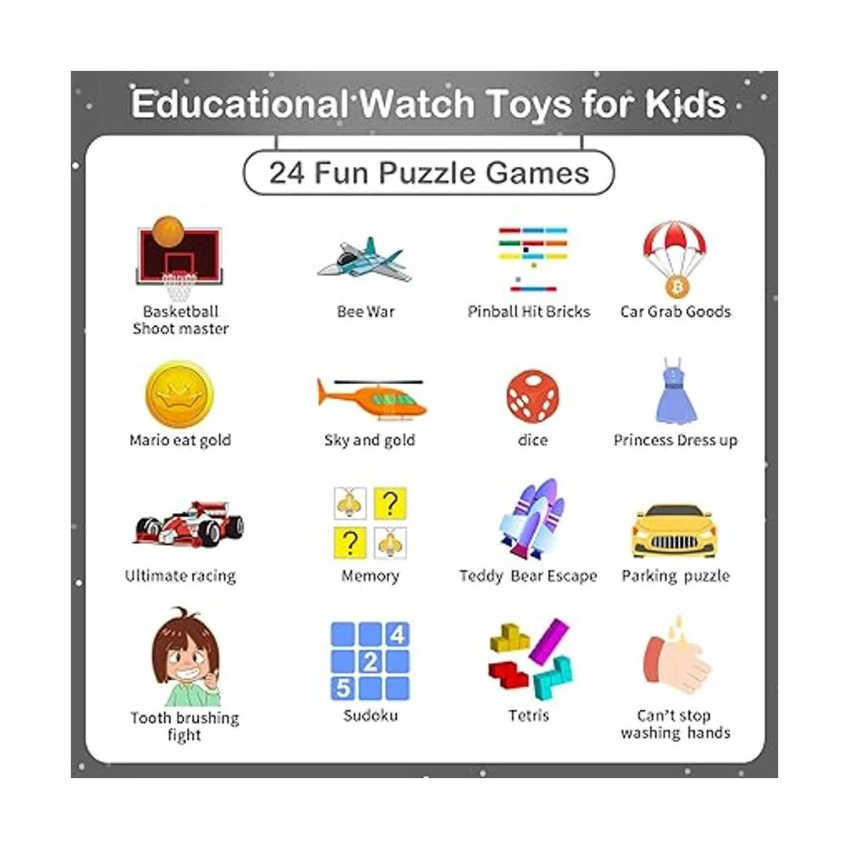 Reloj inteligente multifuncional para niños: reloj inteligente para niños con cámara de selfie, 16 juegos, linterna, reproductor de MP3, grabadora de voz, podómetro, alarma, cronómetro, calculadora, tema, selección de salvapantallas, tiempo de retroiluminación, perfil silencioso, cinco idiomas de país, volumen de tono de llamada, etc.