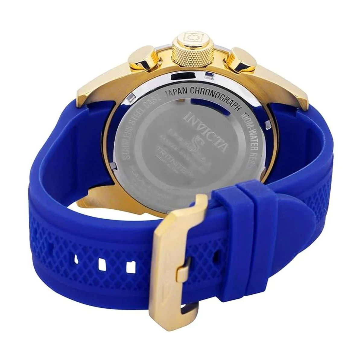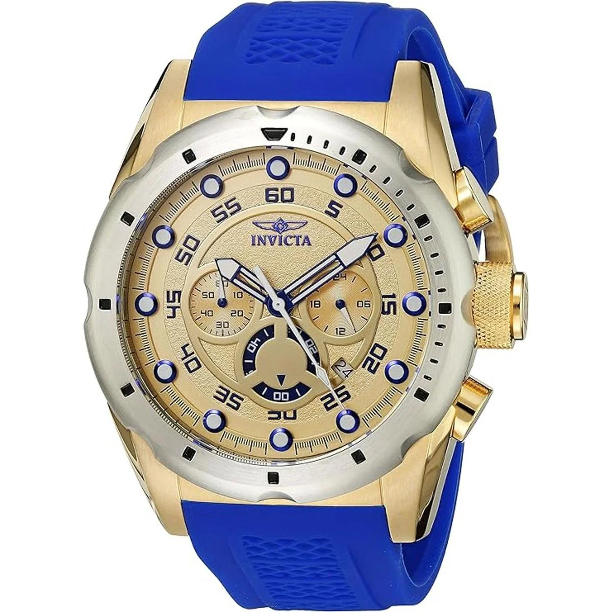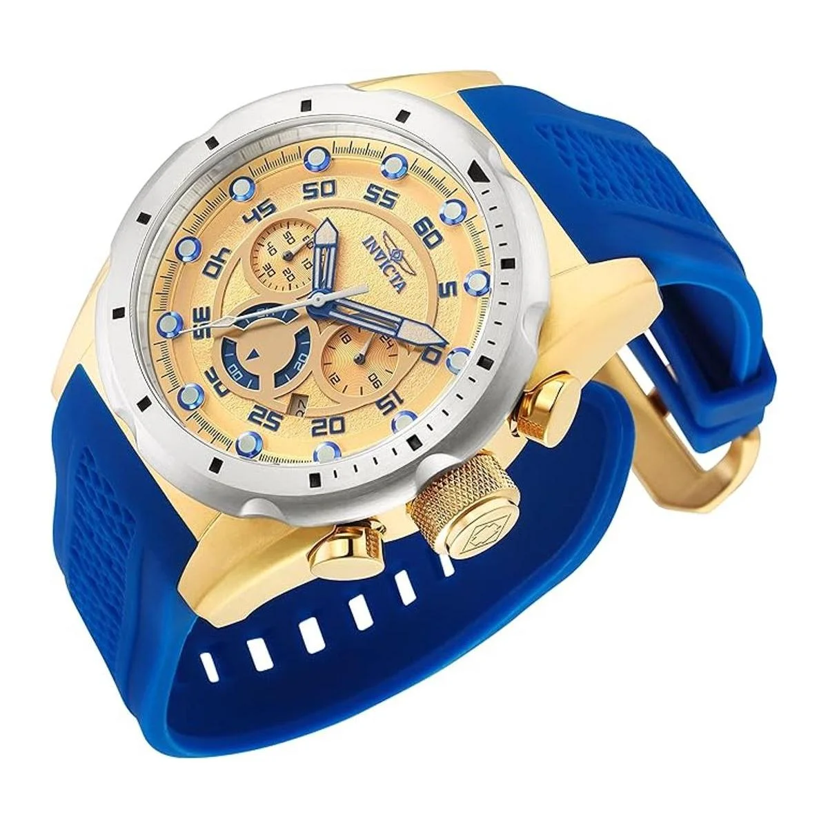 El reloj cronógrafo Invicta 20307 Speedway para hombre cuenta con una caja de acero inoxidable sólido chapado en oro amarillo de 1.969 in de ancho y 0.669 in de grosor, con un bisel fijo y corona con textura con empuje y empujadores de función. Invicta 20307 es alimentado por el movimiento de cronógrafo de cuarzo japonés TMI VD53. Este elegante reloj también cuenta con una esfera de tono dorado con textura con detalles blancos y manecillas de esqueleto luminosas azules y marcadores de hora de punto, junto con las funciones de cronógrafo, visualización de fecha y hora de 12/24 horas, resistente a los arañazos, fusiones de llama, cristal y resistente al agua hasta 100 metros. Invicta 20307 está equipado con una correa de goma de poliuretano azul de 1.024 in de ancho con un cierre de hebilla. El reloj cronógrafo para hombre Invicta 20307 con esfera dorada azul y correa de poliuretano viene en una caja de regalo original de Invicta y está avalado por una garantía limitada de 5 años.