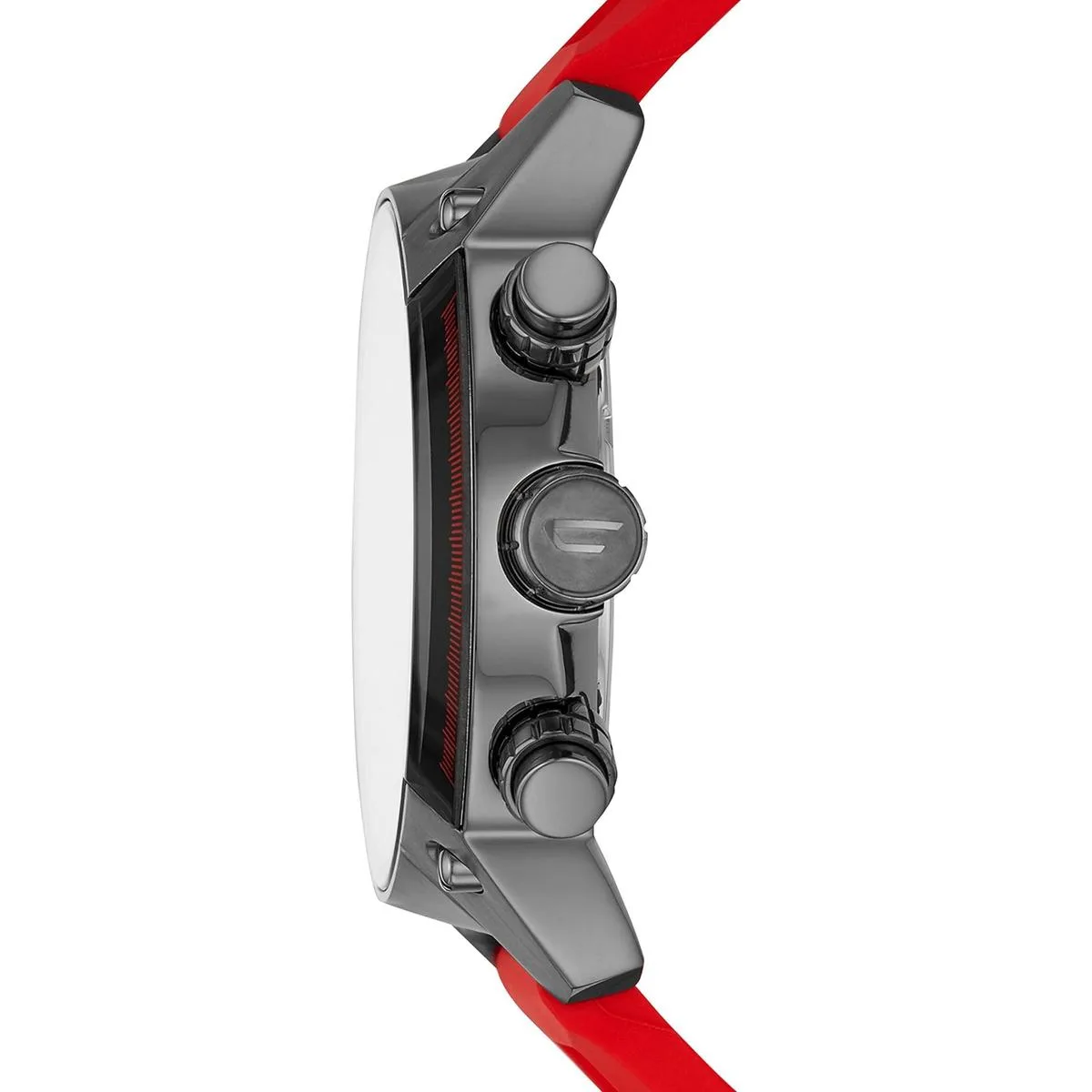 This modern Diesel mens Overflow watch has plenty of edge with a gunmetal case, gray chronograph dial and red silicone strap.