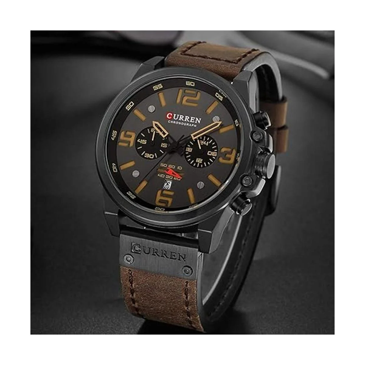 Diseño: color negro por tecnología chapada en IP, y esfera de reloj de diseño de moda, correa de cuero, resistencia a la abrasión; proporciona una experiencia de uso cómoda