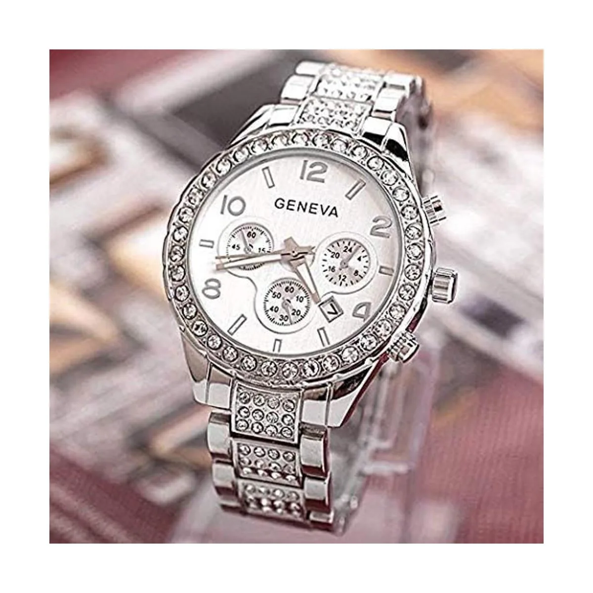 Reloj único de acero inoxidable. La cubierta del reloj tiene un círculo de diamantes de imitación brillantes, que es hermoso