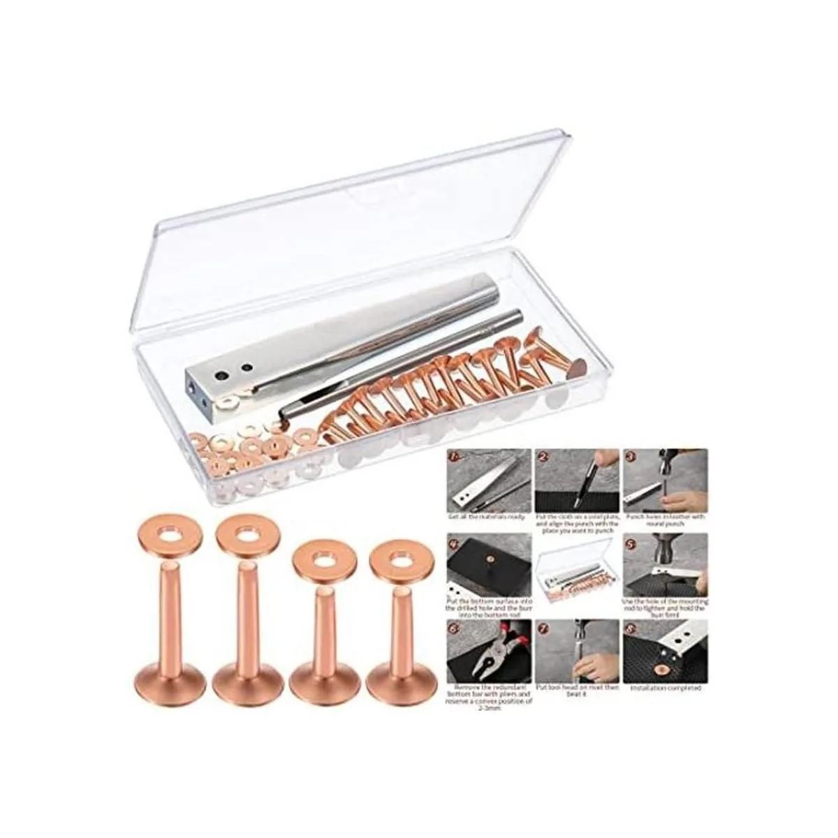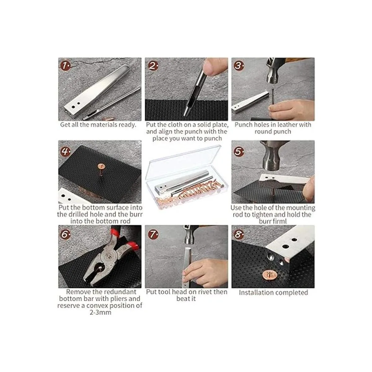 4 tipos de herramientas: 24 remaches de cobre en 2 tamaños, 24 rebabas de cobre, 1 cortador de agujeros de cuero y 1 cortador de rebabas para la instalación de remaches de cobre número 9 y número 12, varias herramientas en cantidad suficiente, fácil de satisfacer tus necesidades de bricolaje.