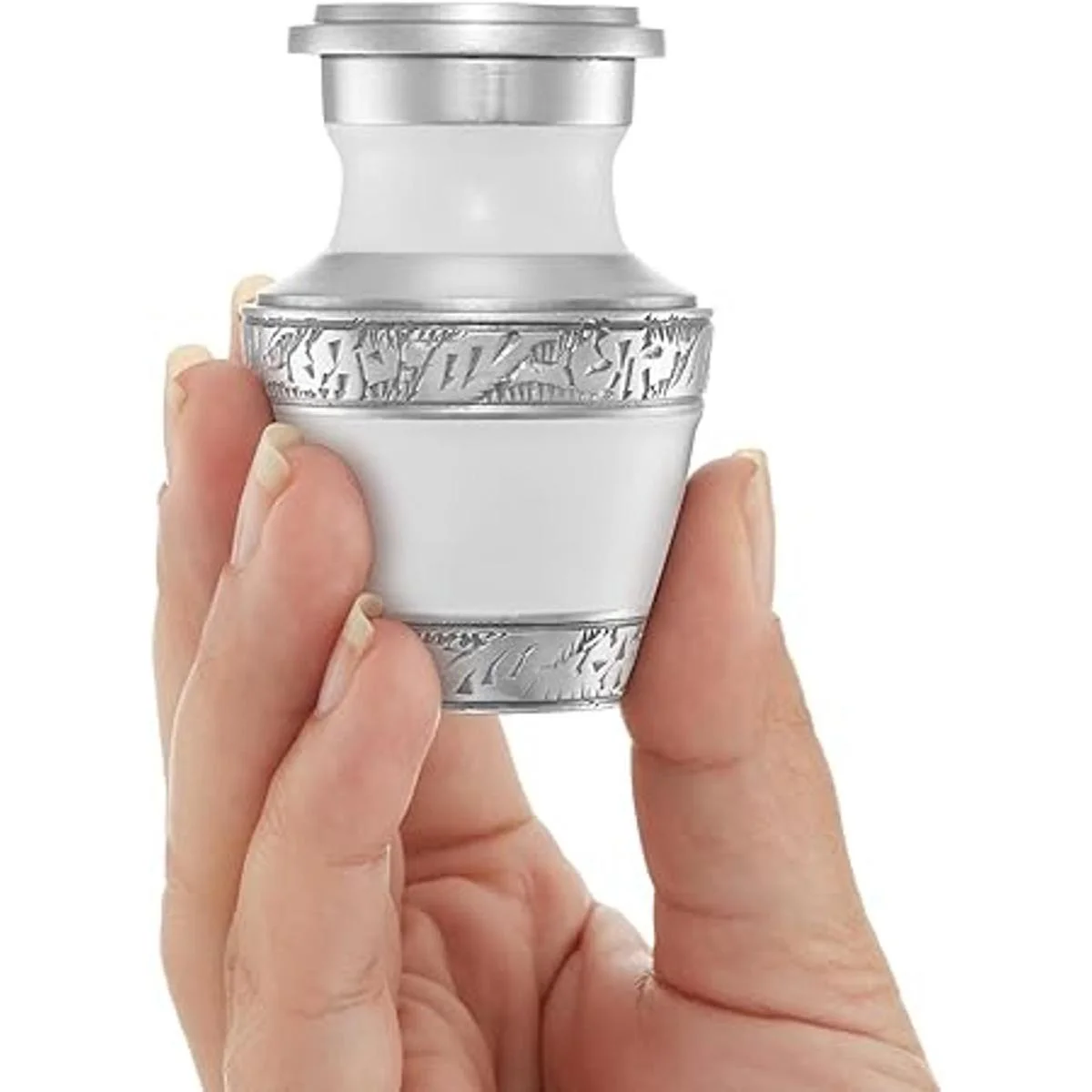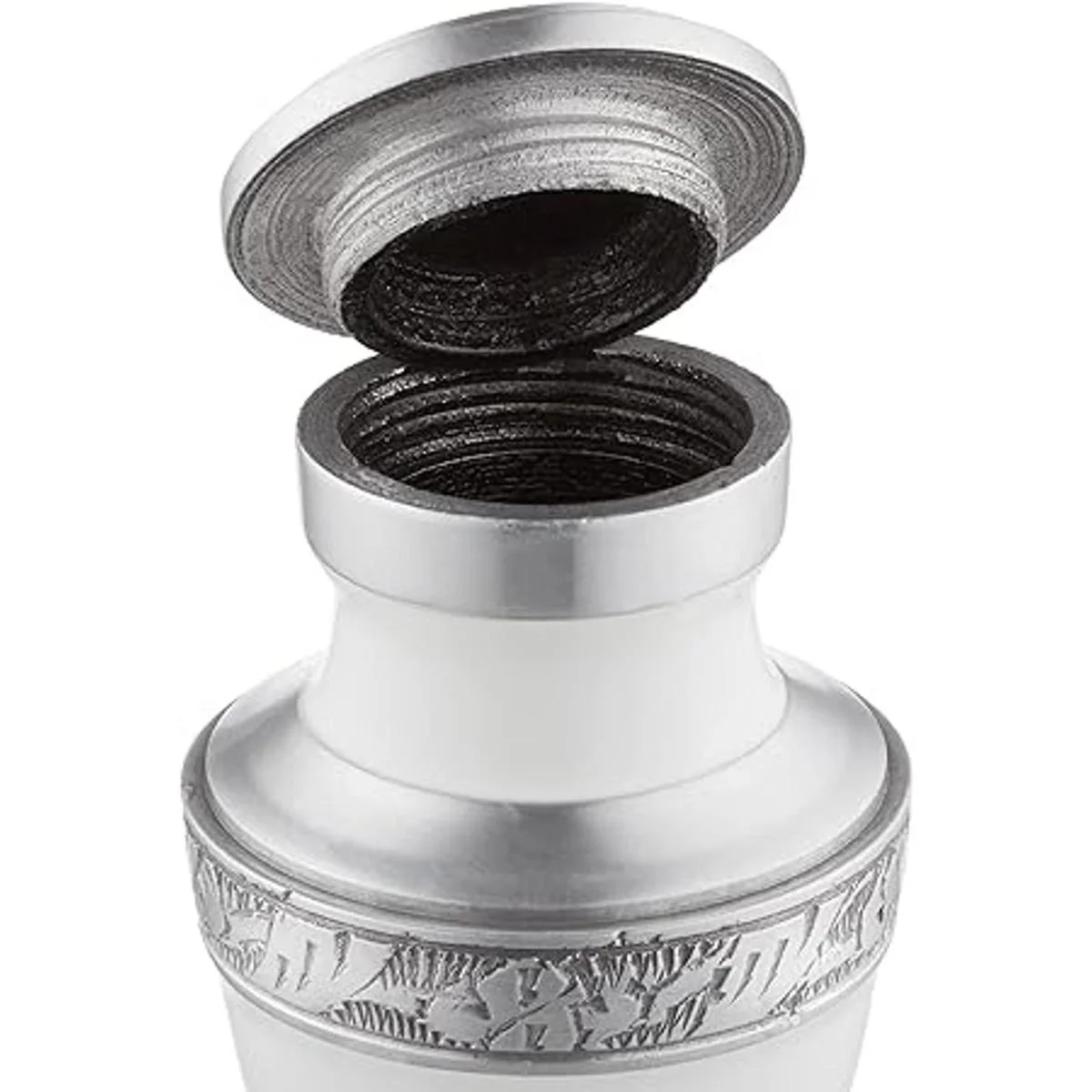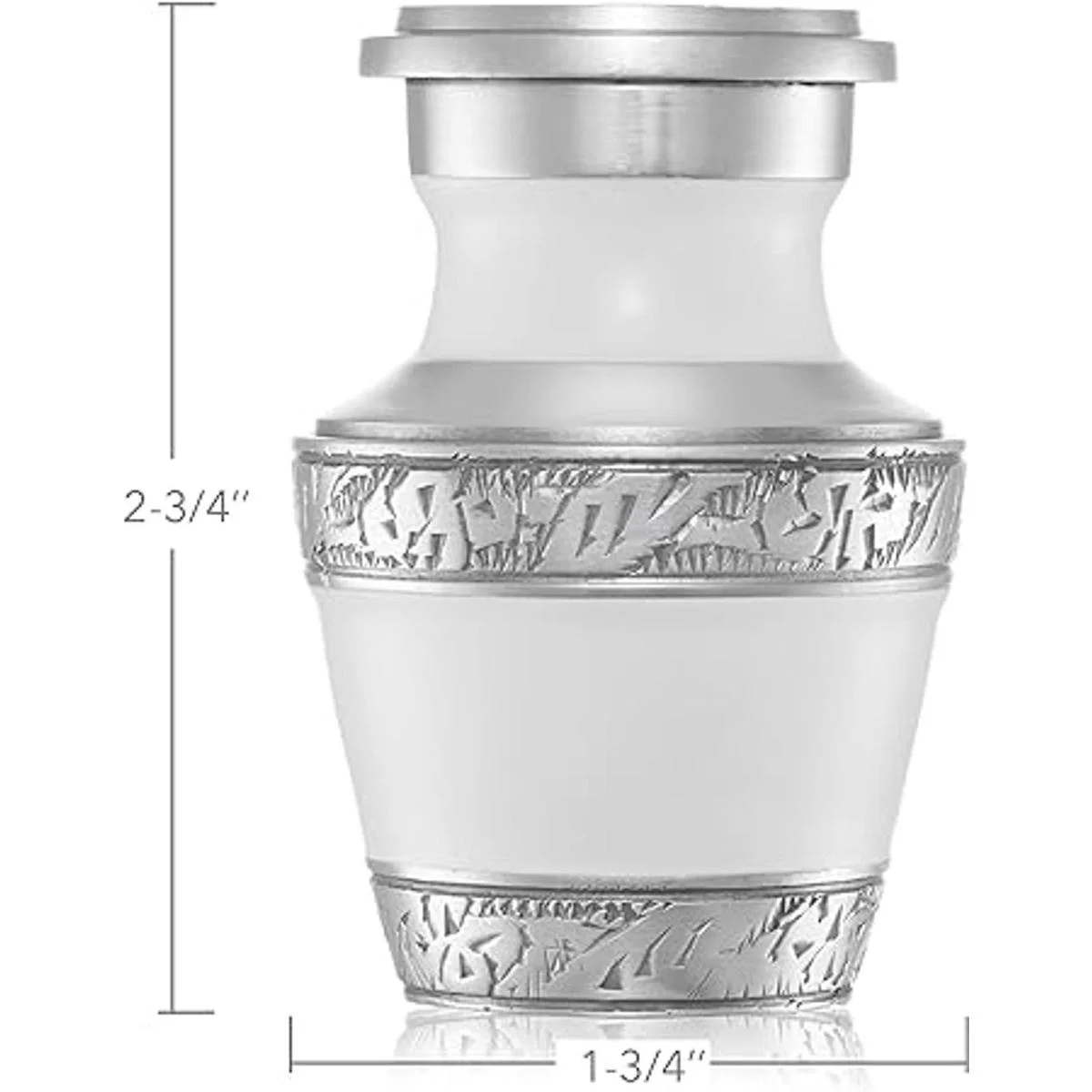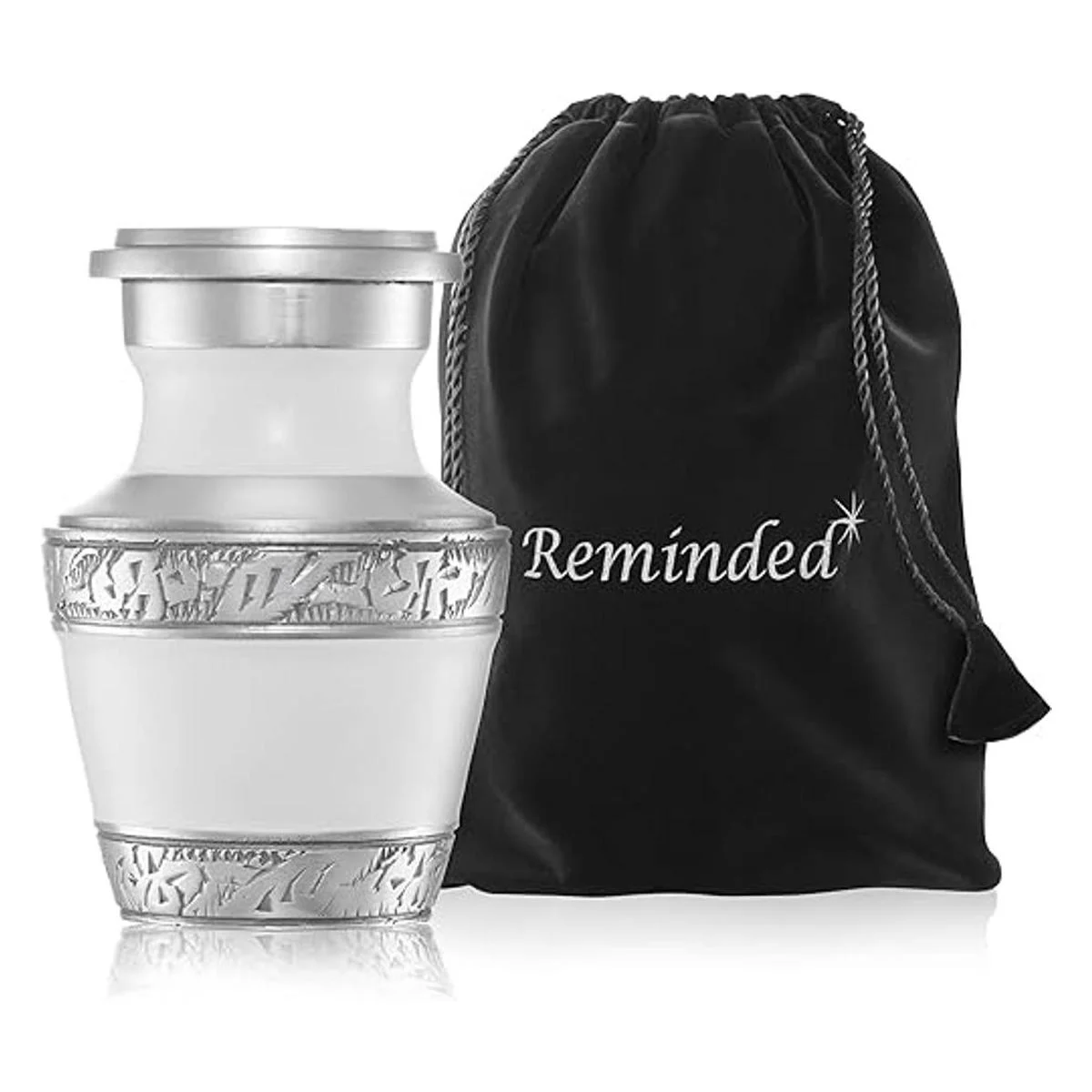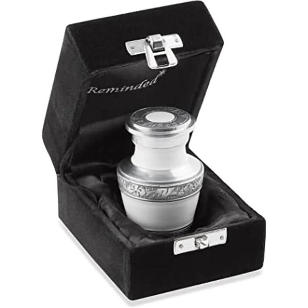 Reminded Urna conmemorativa de cremación pequeña para cenizas humanas, urna de recuerdo en miniatura blanca y plateada con estuche de terciopelo