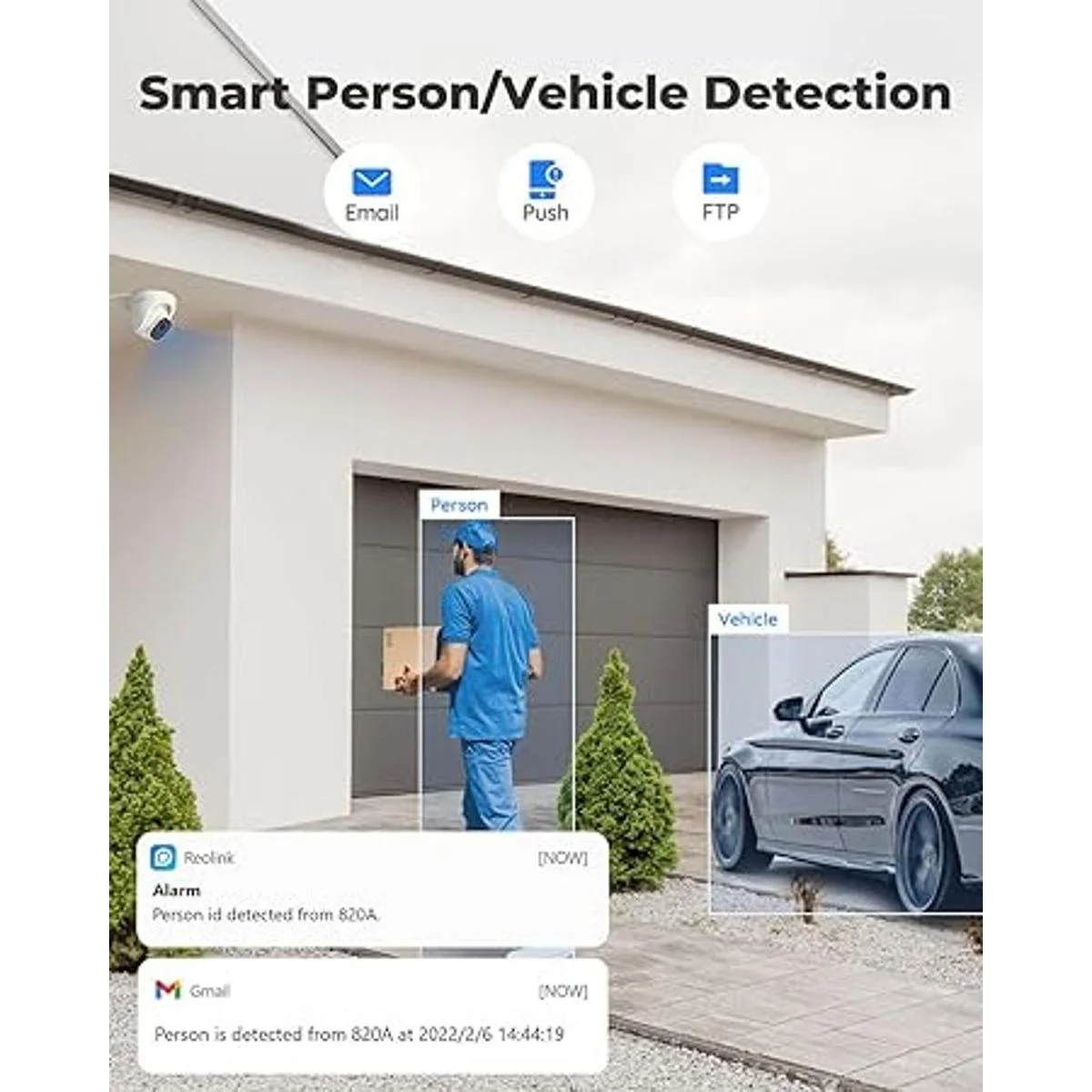 Detección humana/vehículo: estas cámaras IP están equipadas con tecnología de detección en el dispositivo para identificar a los seres humanos y vehículos de otros objetos. Con una detección precisa, puedes mantener un ojo más nítido en las verdaderas amenazas y liberar tu mente de alertas innecesarias.