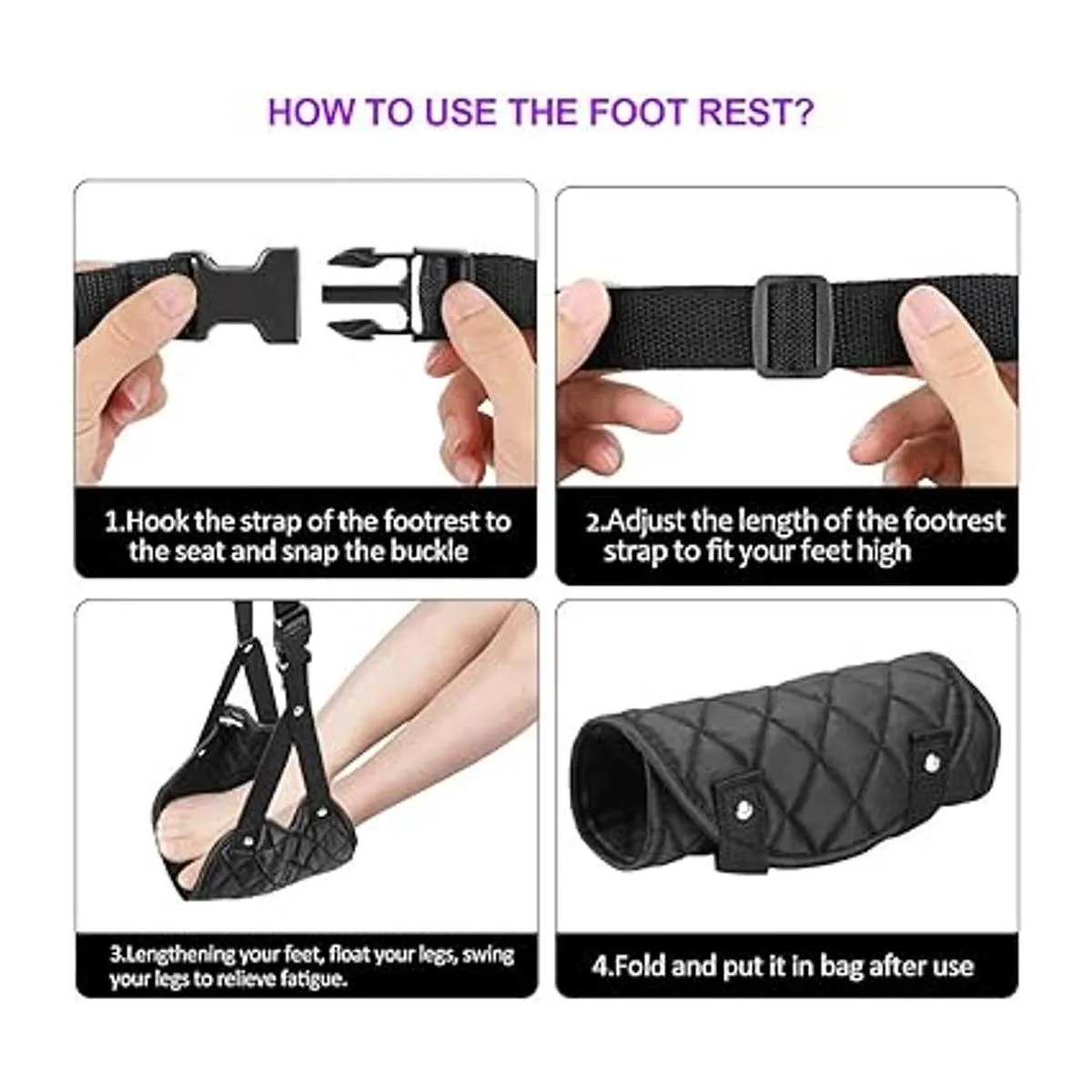 Coloca la parte del reposapiés en los lados de cualquier escritorio y coloca tus pies en el reposapiés. Puedes ajustar la longitud de la cuerda para mantener tus pies en la posición más cómoda. Cambia tus piernas para aliviar la fatiga.