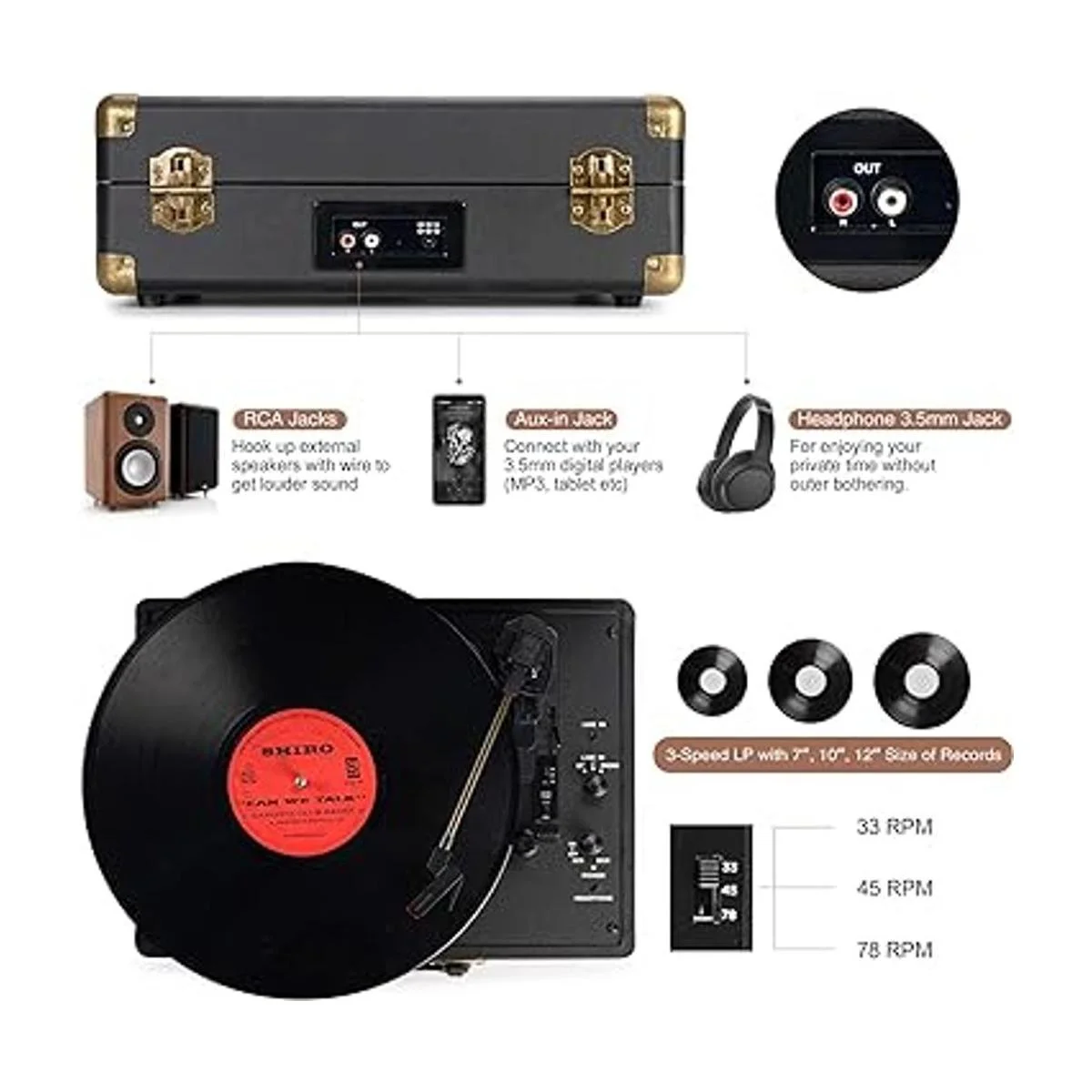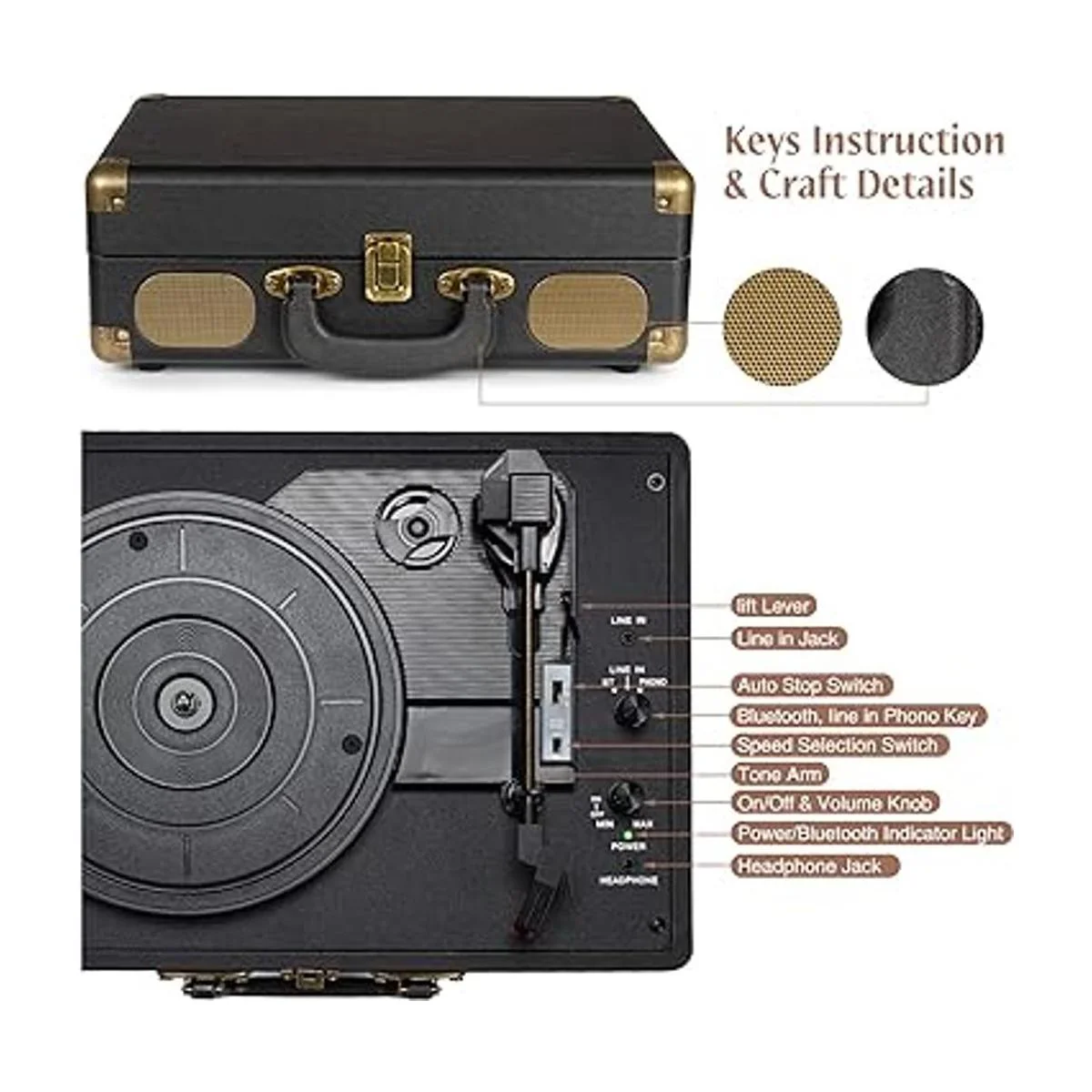 Reproductor de discos de vinilo de 3 velocidades, maleta Bluetooth portátil con correa con altavoces integrados, RCA Line Out AUX en conector de auriculares vintage
