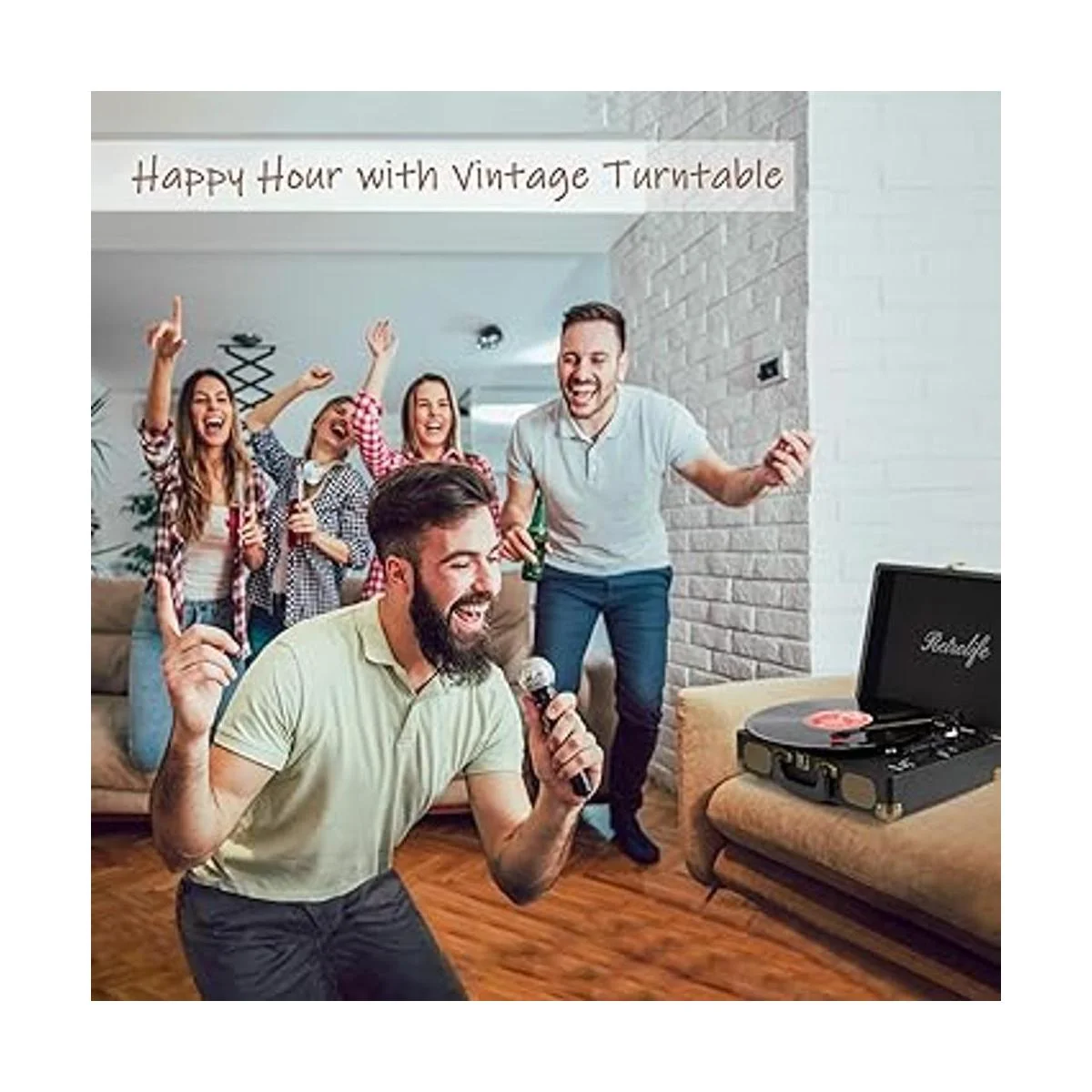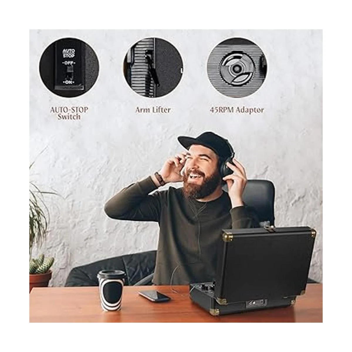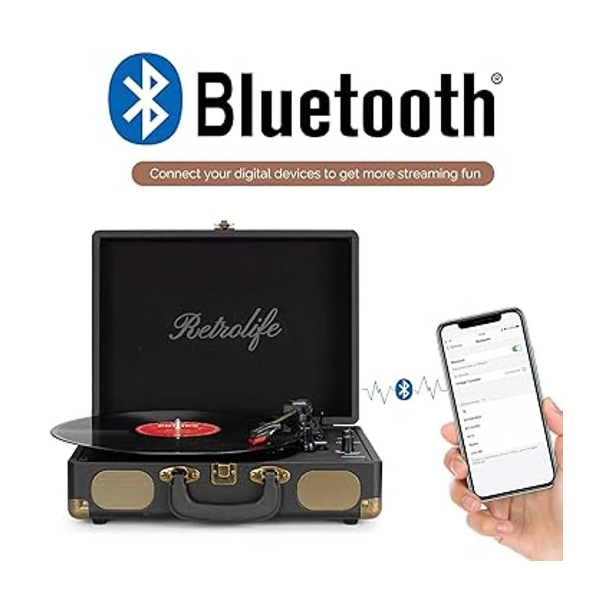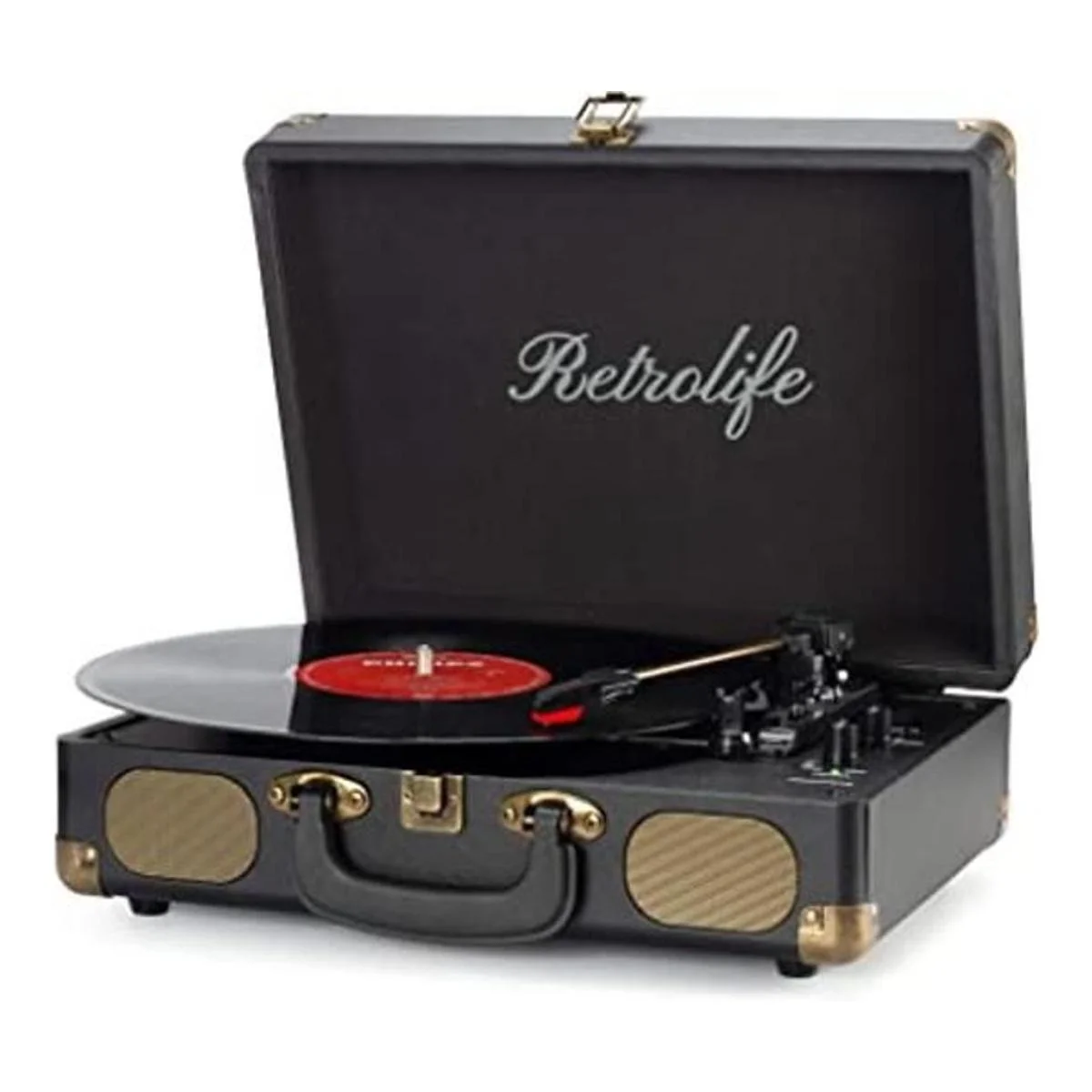 Reproductor de discos individual de maleta Retrolife: un combo satisfactorio de elementos modernos y vintage. Aspecto clásico de piel sintética negra con tornillos y redes de metal de bronce retro, puedes llevarlo a todas partes con su mango sólido. Prepárate para crear tus propios recuerdos musicales.