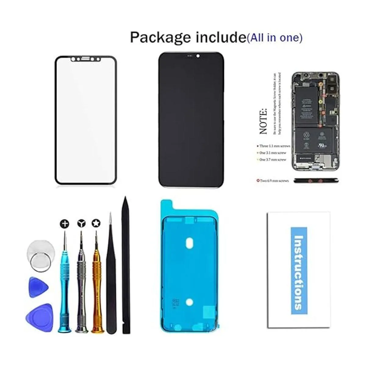 El paquete incluye como se muestra en la imagen: 1 pantalla LCD de repuesto para iPhone XS MAX un juego de herramientas de reparación 1 vidrio templado instrucciones almohadilla de tornillo sello impermeable