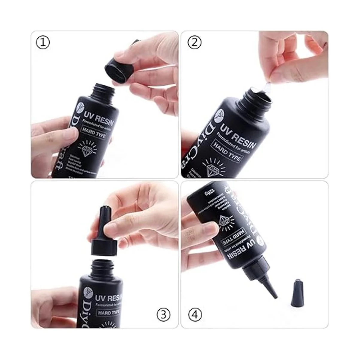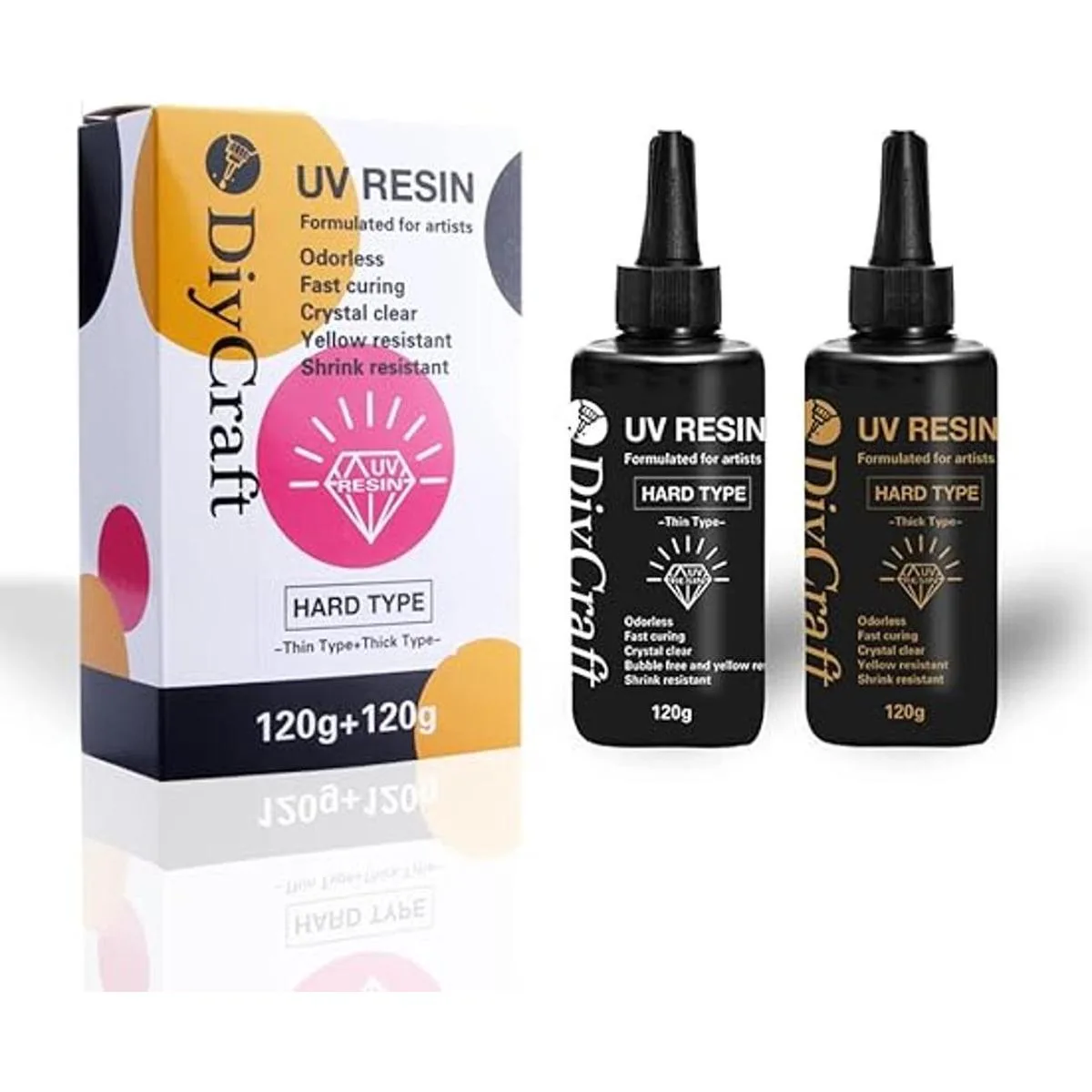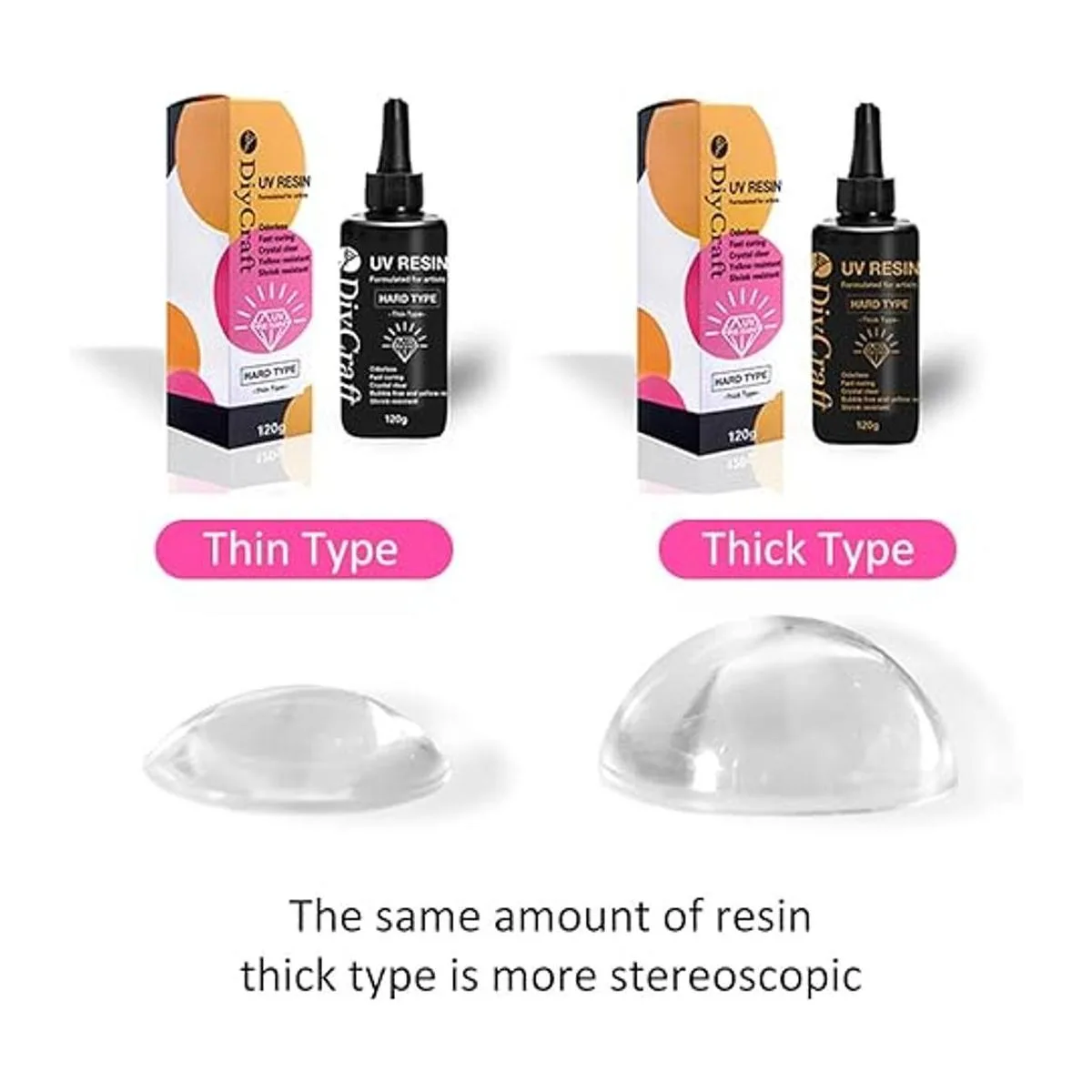 Juego de resina UV: este juego incluye un tipo fino de 4.23 oz y un grosor de 4.23 oz. Dos tipos de resina UV para satisfacer tus diferentes necesidades creativas.