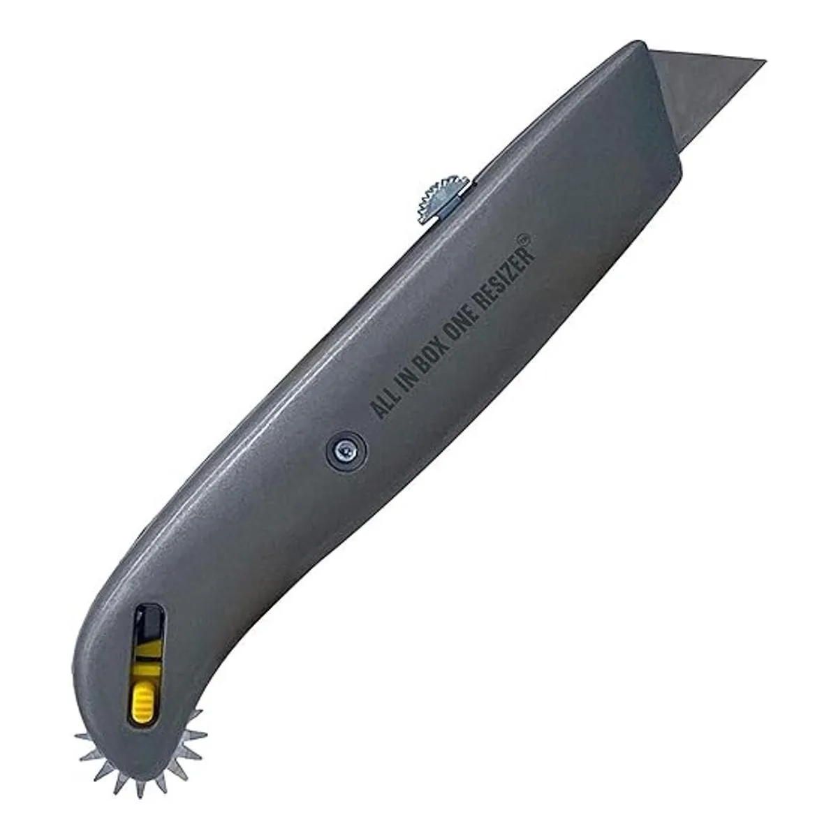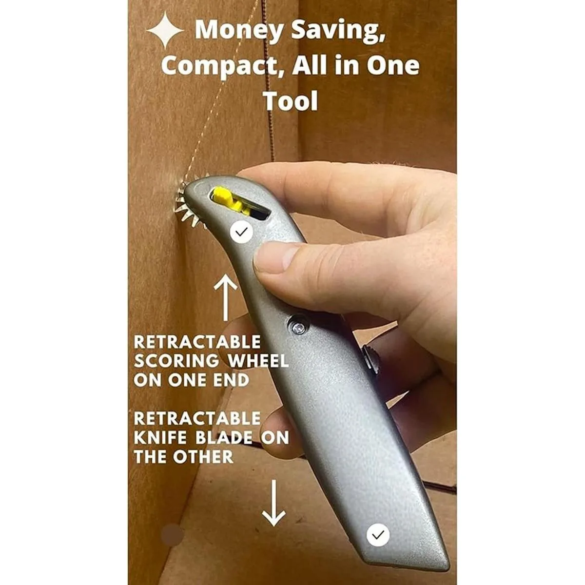 Herramienta de ahorro de dinero Herramienta de cambio de tamaño de caja de envío de cartón. Abridor de cajas/cuchillo en un extremo, rueda de puntuación retráctil giratoria en el otro extremo