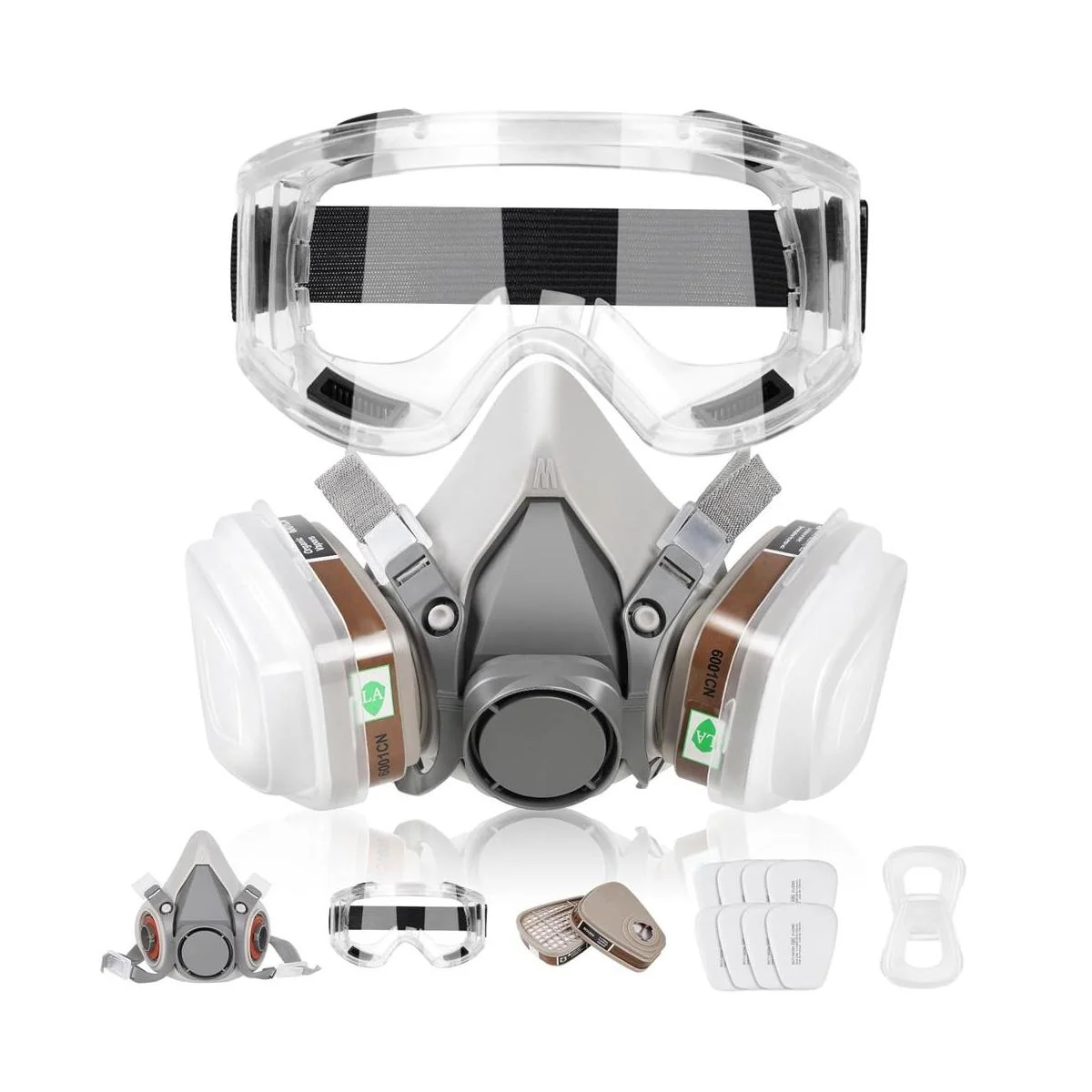 El paquete incluye: 1 respirador de polvo, 2 cartuchos de filtro de carbón activado, 8 filtros de algodón, 2 fundas de plástico, 1 gafas.