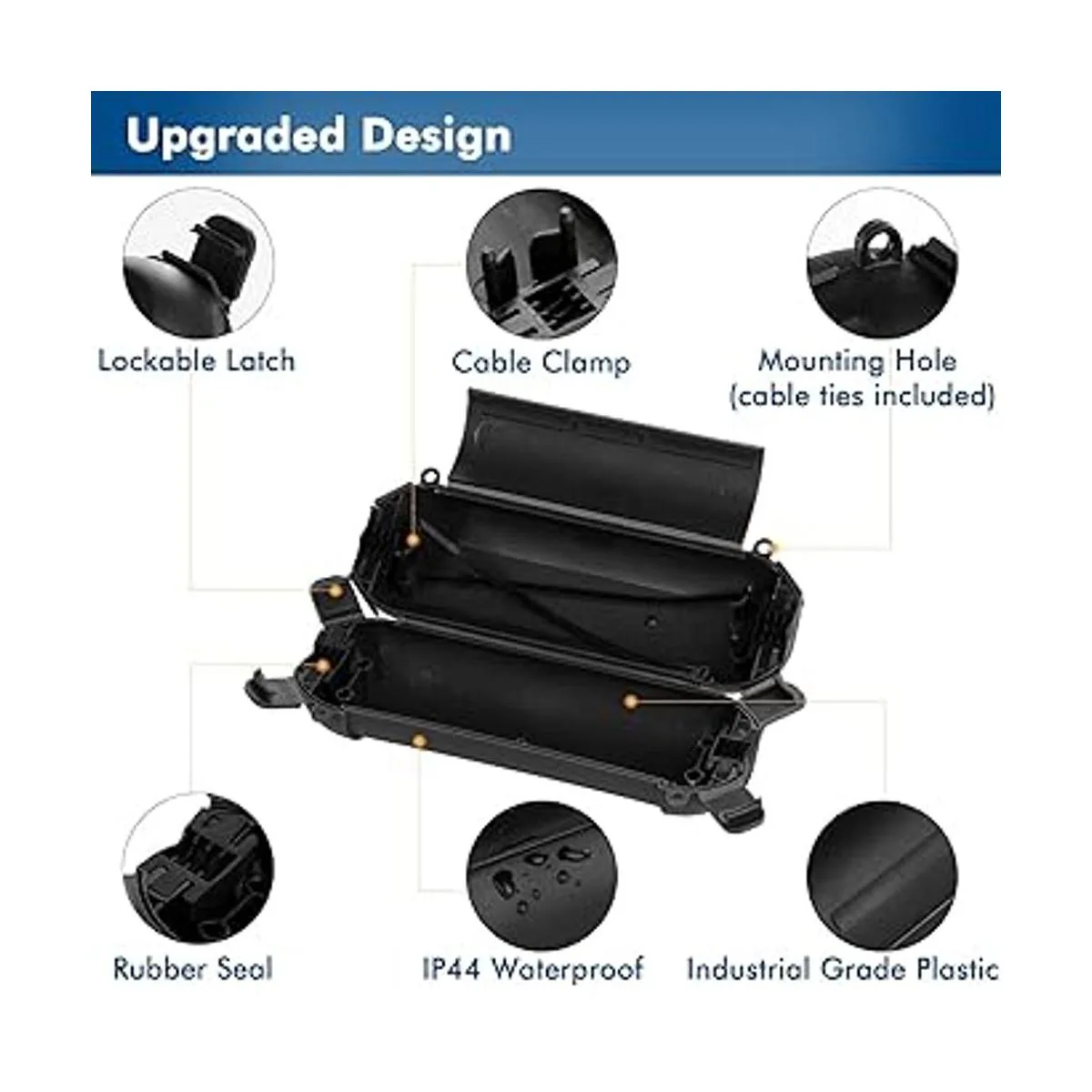 Fácil de usar: no requiere instalación, se abre fácilmente con la tapa superior y 4 pestillos coloque la conexión en el interior, sujeta el cable con abrazaderas de cable, bloquea y sella.