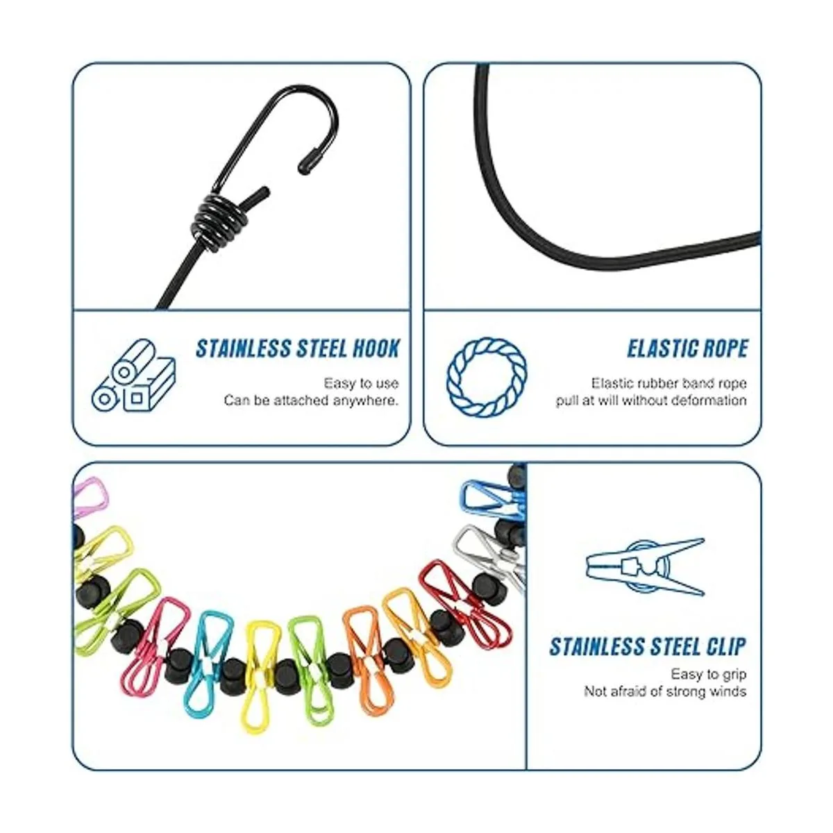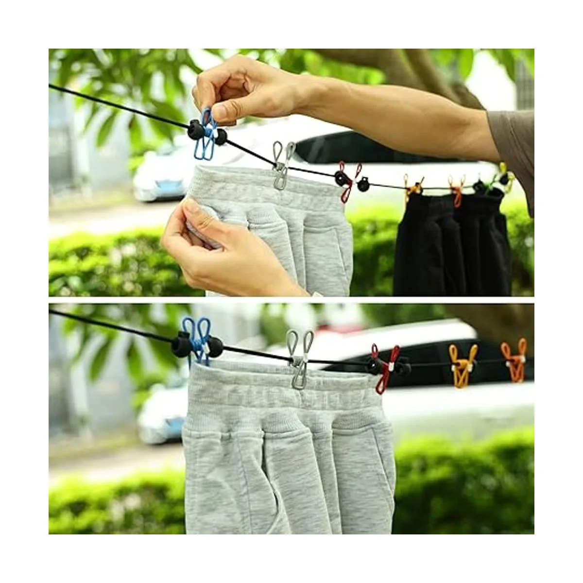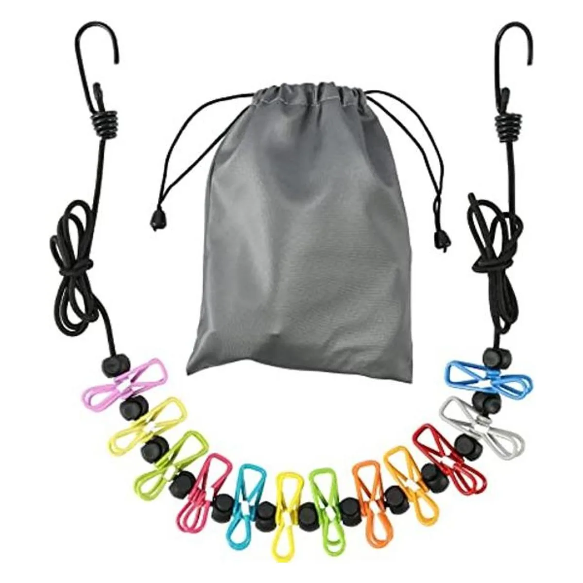 Creative DesignPortable Clothesline with 12 Colorful Clothespins13 AntiSkid Clips can windproofDesign with Positioning BeadCan move smoothly from left to rightthe black rope is stretchy can be stretch up to 10 12 feetno need to worry that clothes bunching up together due to weight or wind and improves drying effect.