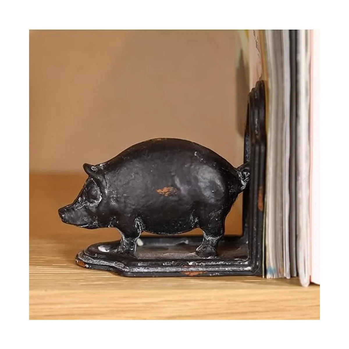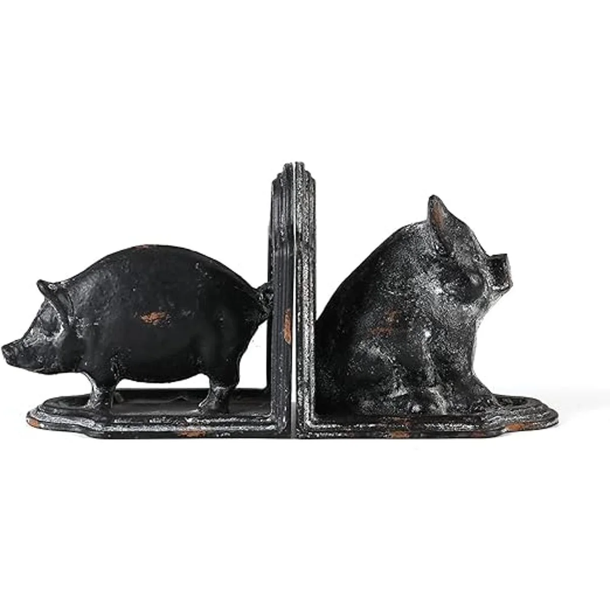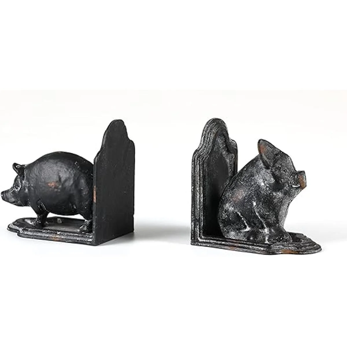Hecho de hierro fundido con un acabado rústico gris inspirado en el viejo mundo, estos sujetalibros de dos cerdos son encantadores y únicos. Dimensiones: 5.0 in de largo x 3.0 in de ancho x 4.6 in de alto. Peso: 2.47 oz cada uno