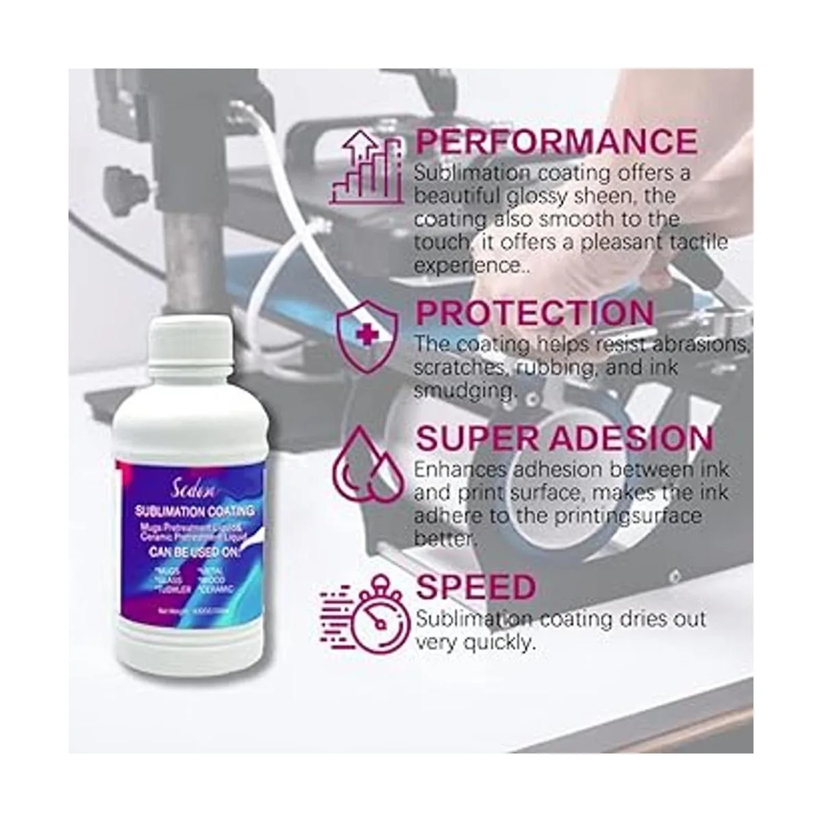 Superadherencia: el líquido de revestimiento de sublimación ayuda a resistir abrasiones, arañazos, rozaduras y manchas de tinta, mejora la adherencia entre la tinta y la superficie de impresión, hace que la tinta se adhiera mejor a la superficie de impresión.