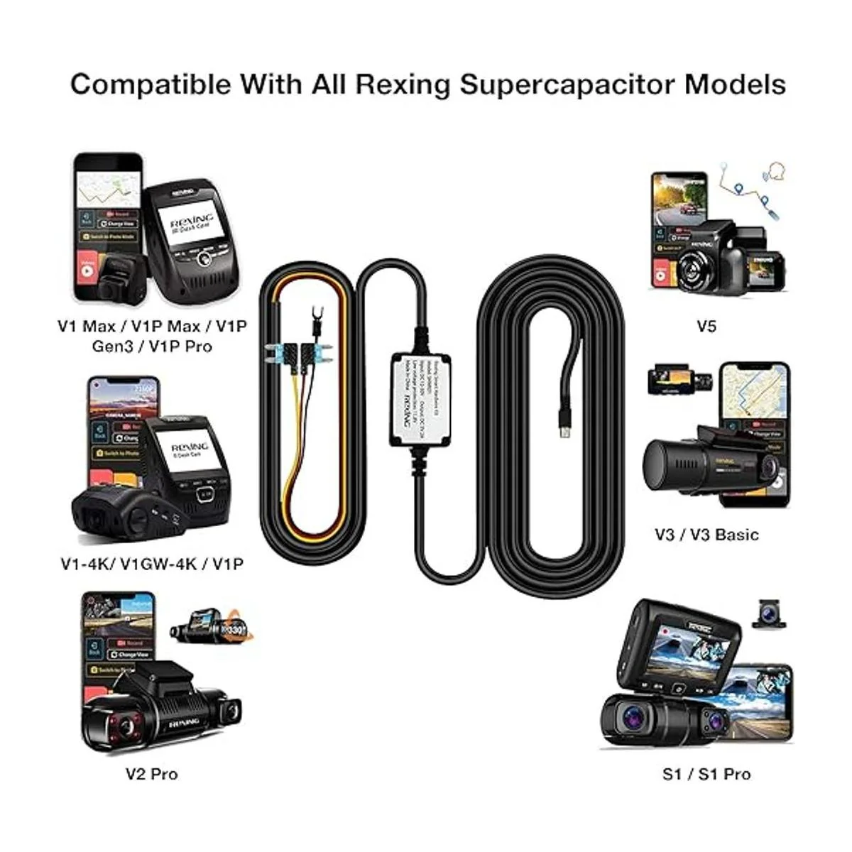 Hecho para usar con todos los modelos de supercondensador Rexing: V14K, V1P, V3, V2 Pro, V5, S1 Series, V1P Pro Series, Max Series, etc