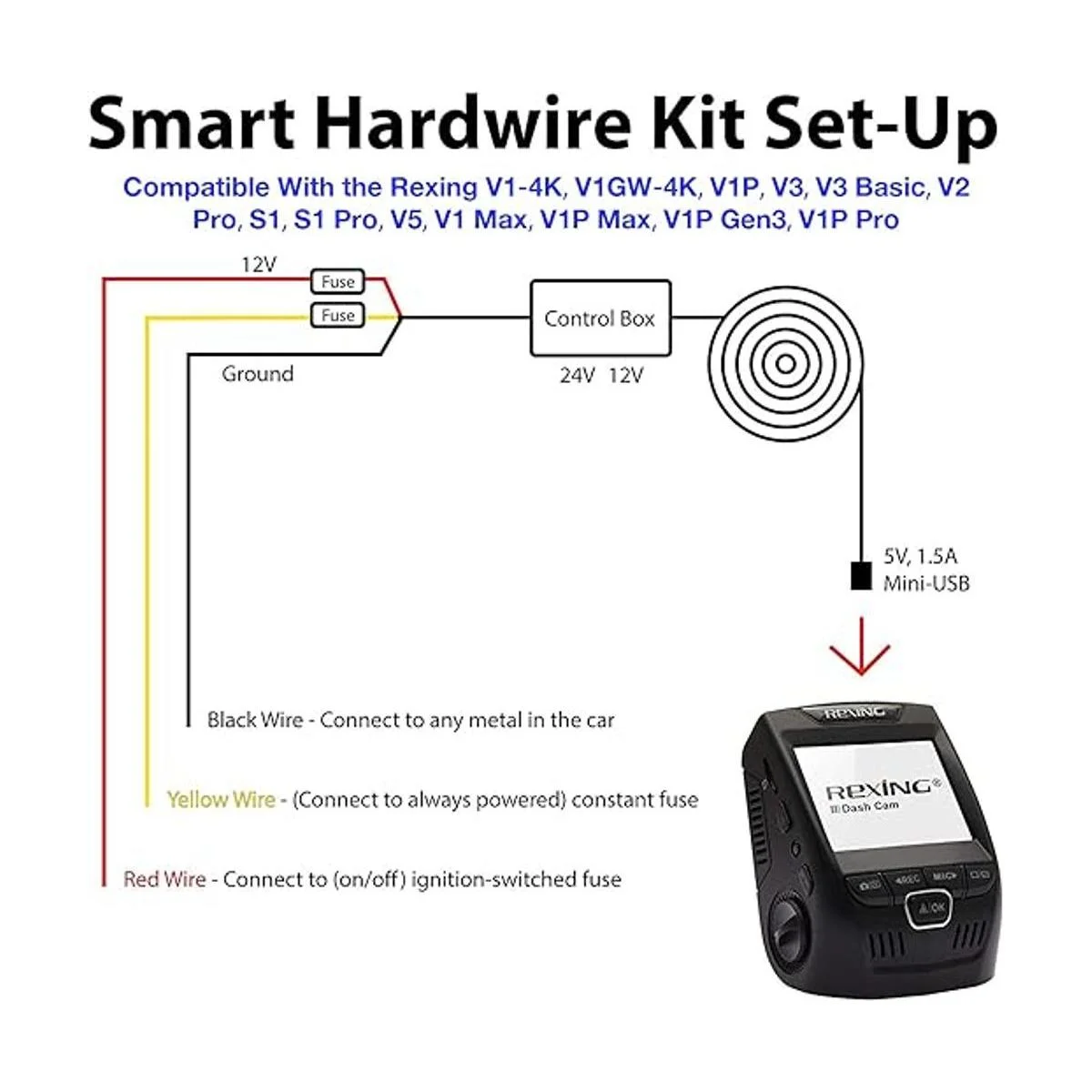 Rexing Kit de cable duro inteligente minipuerto USB para todos los modelos de supercondensadores Rexing V14K, V1P, V3, V2 Pro, V5, S1 Series, V1P Pro Series, Max Series Dash Cams, etc