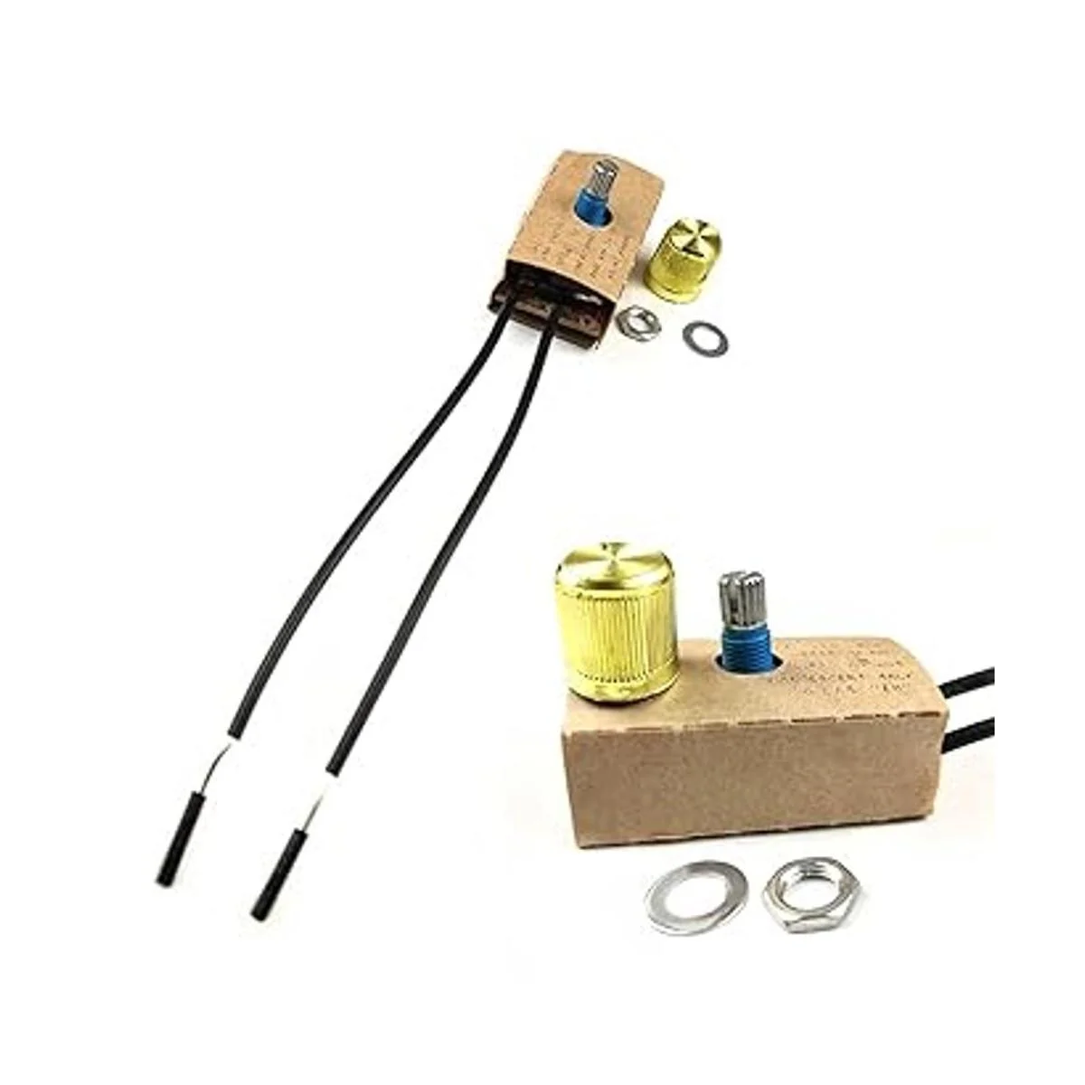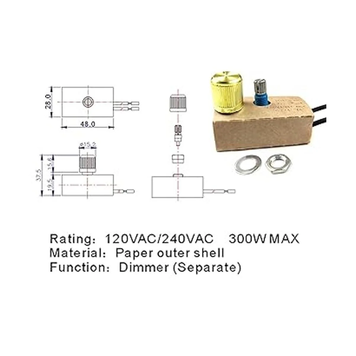 Material: carcasa exterior de papel latón. Función: regulador. Interruptor de atenuación en línea para lámparas de mesa y de pie.