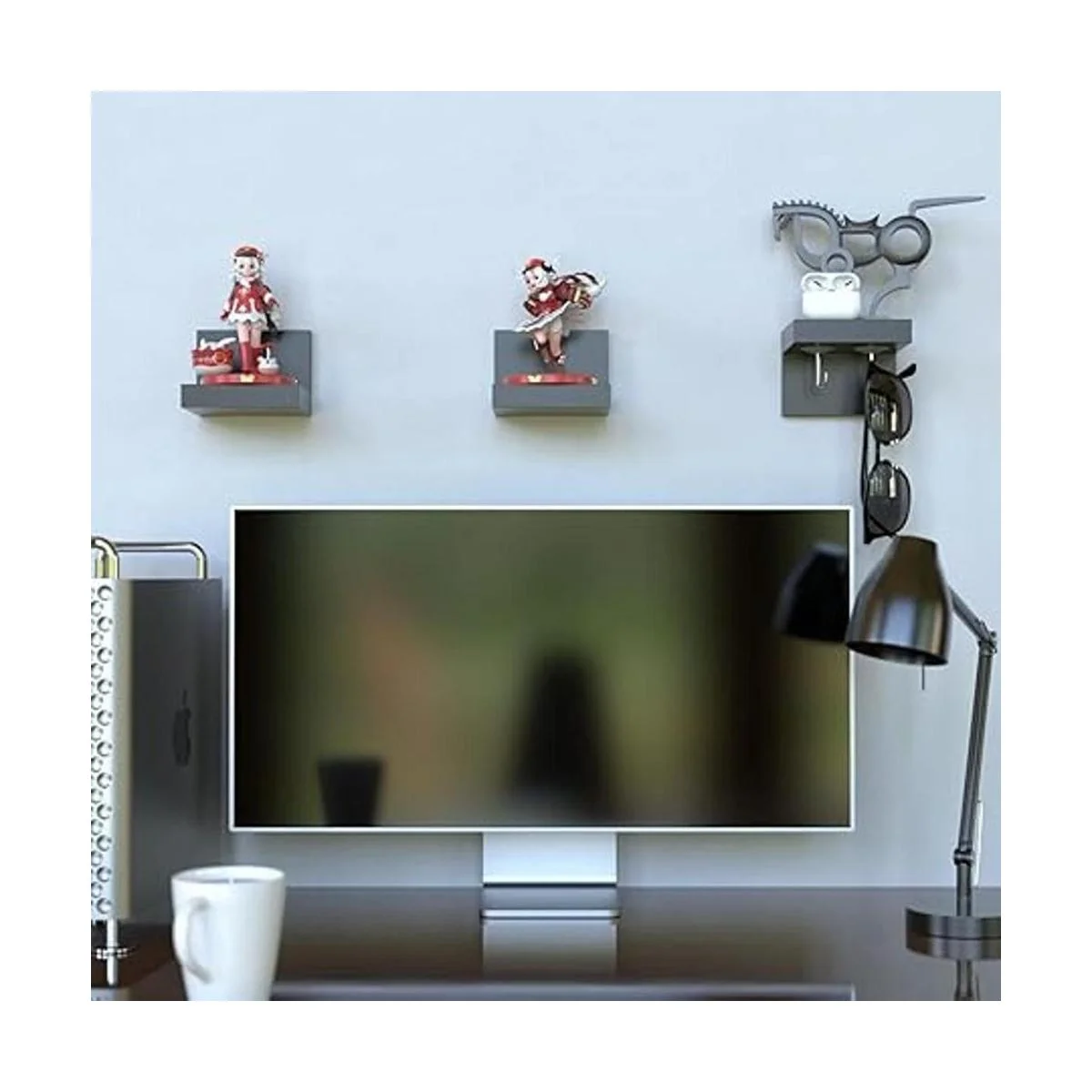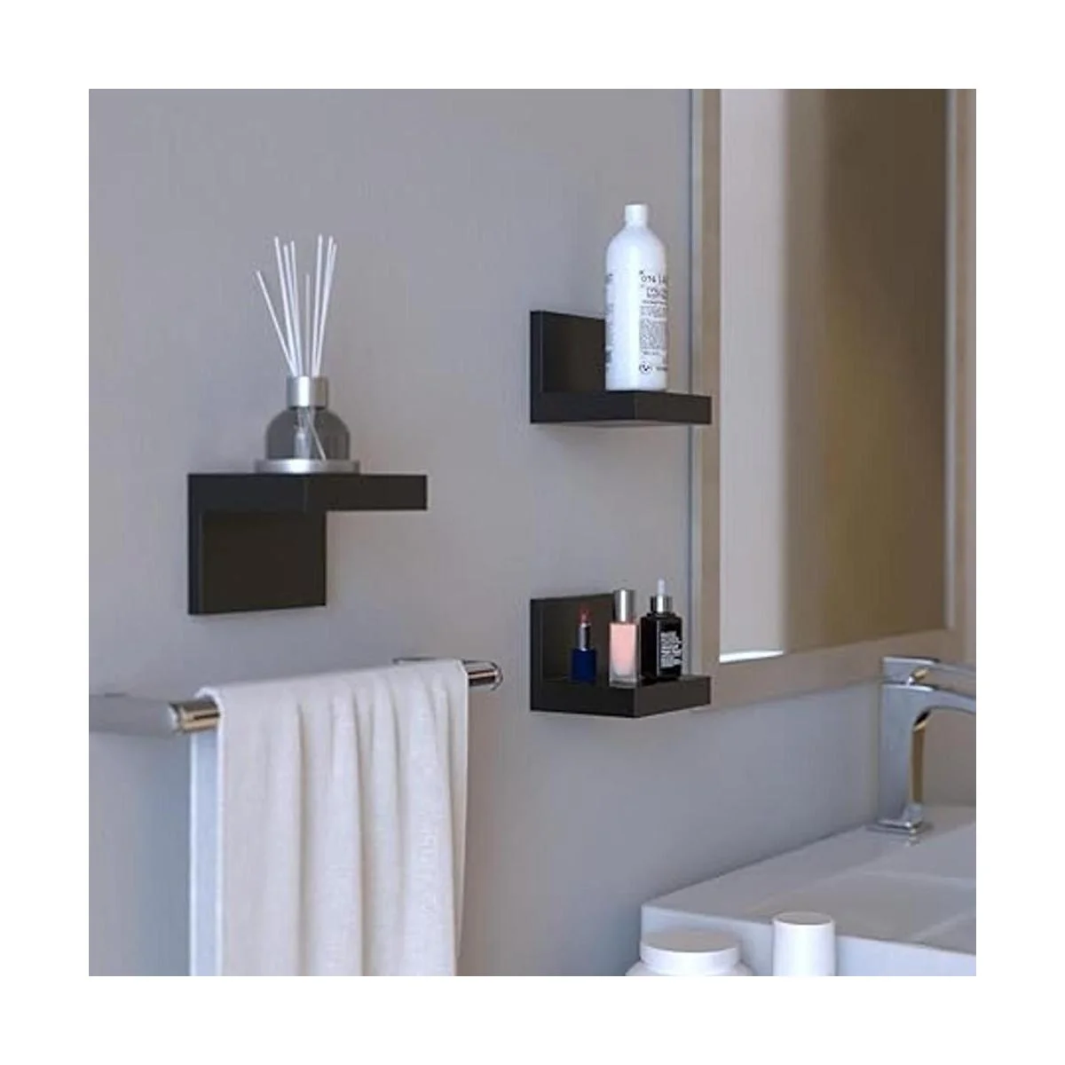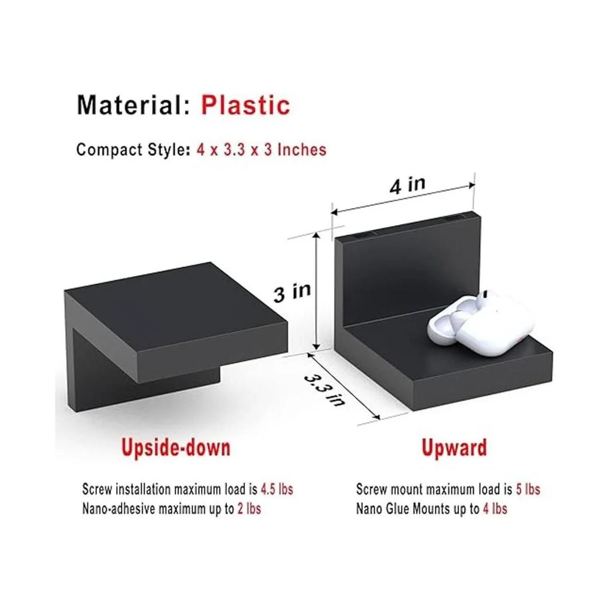 Rendimiento duradero: este pequeño estante está hecho de plástico ABS de alta calidad que es ligero y duradero, tiene una fuerte aplicabilidad. El tamaño de cada estante es de 4 x 3.3 x 3 pulgadas, la capacidad de peso es de 4.8 libras si se instala con tornillos, y puede soportar hasta 3 libras si se instala con cintas.