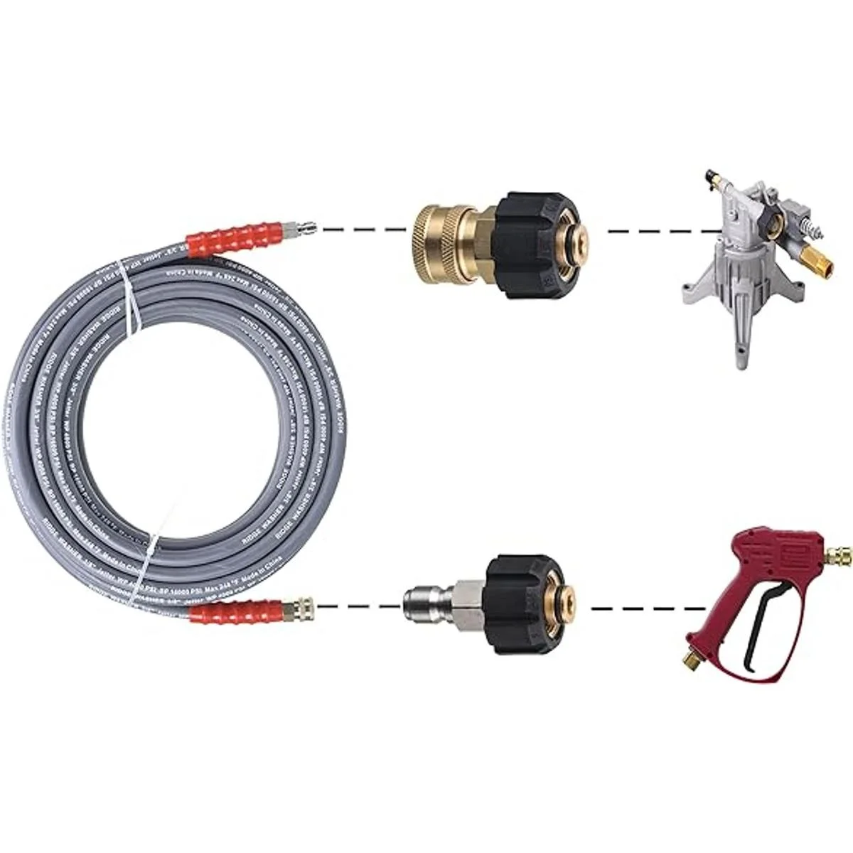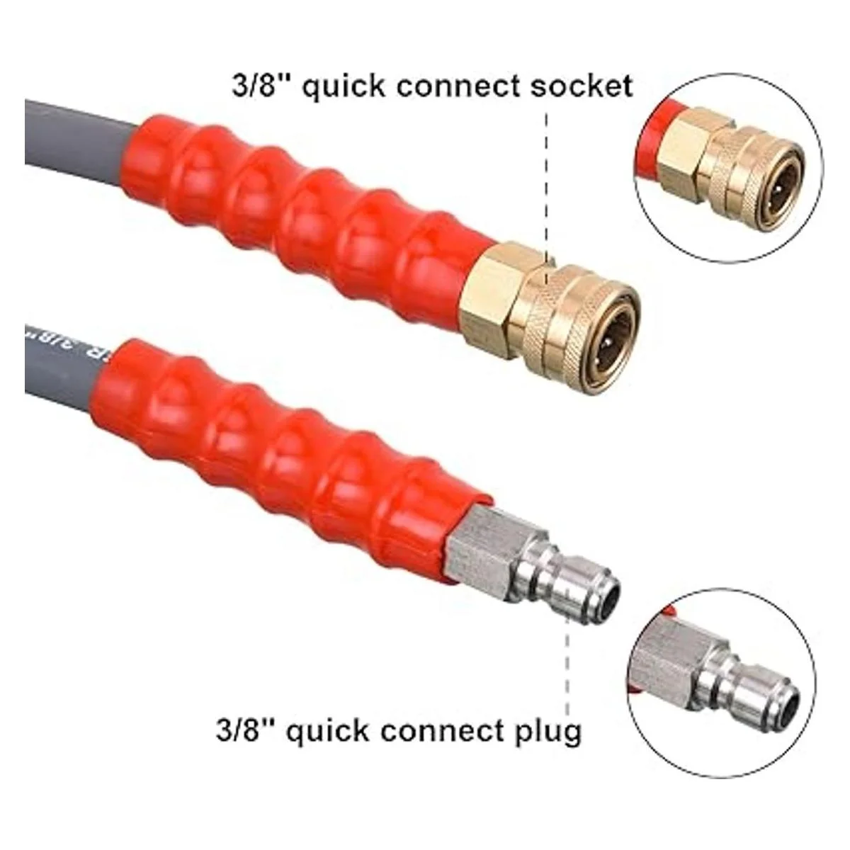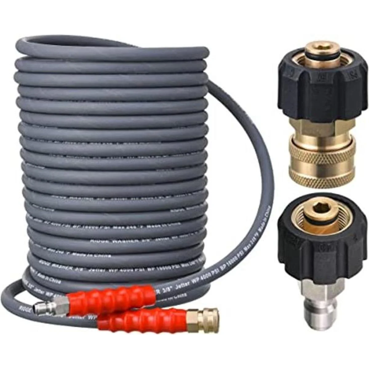 El paquete incluye: manguera de lavado a presión de una pieza de 50 pies, una pieza M22 hembra de 0.551 in enchufe macho de 3/8 pulgadas y una pieza M22 hembra de 0.551 in enchufe hembra de 3/8 pulgadas.