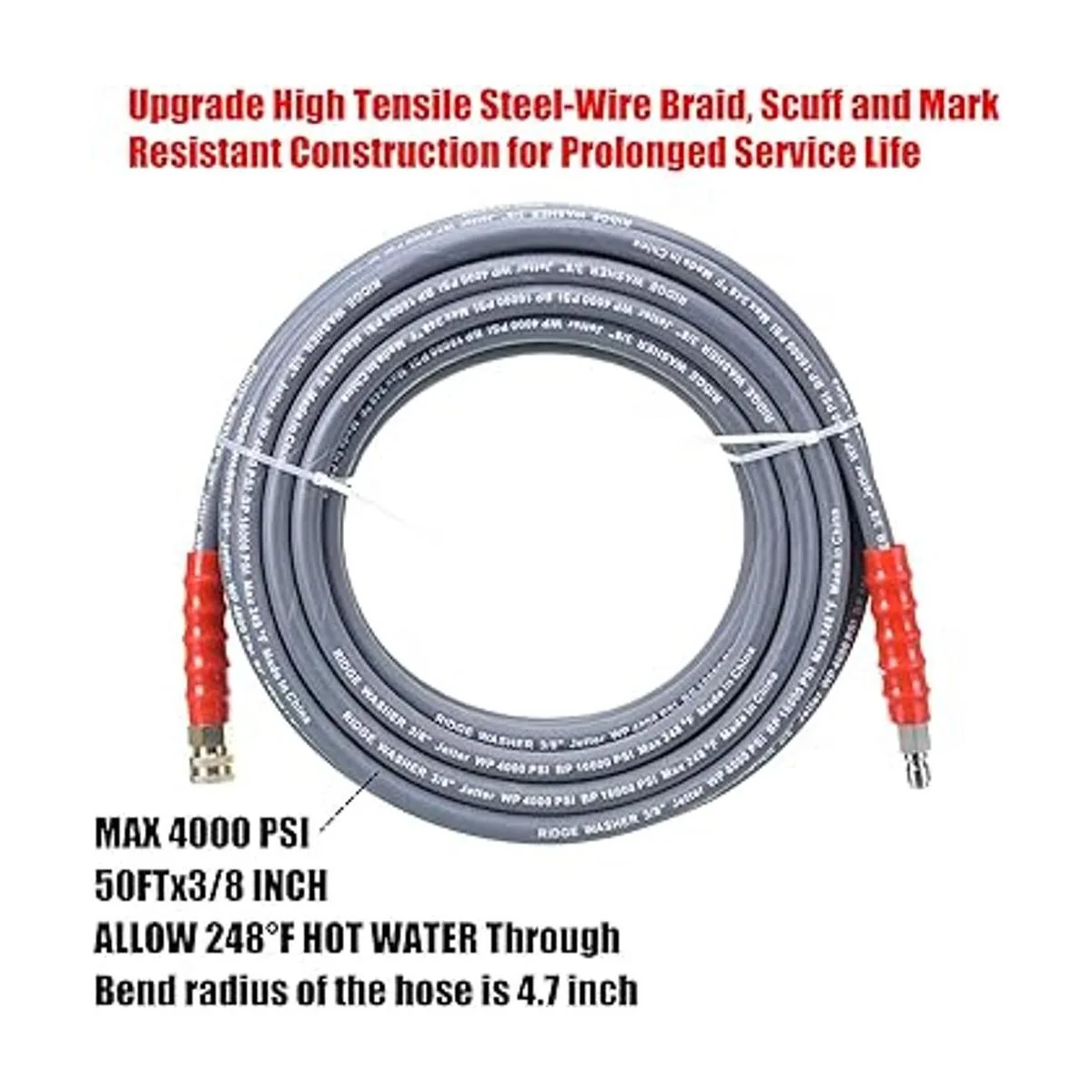 Estructura sólida: el reemplazo de la manguera de lavado a presión está hecho de goma con una capa trenzada de alambre de alta resistencia. Su presión de trabajo de la manguera de lavado de alta presión está clasificada a 4000 PSI. La presión de ráfaga está clasificada a 16000 PSI. El caudal está diseñado para 2.5 GPM a 5 GPM.