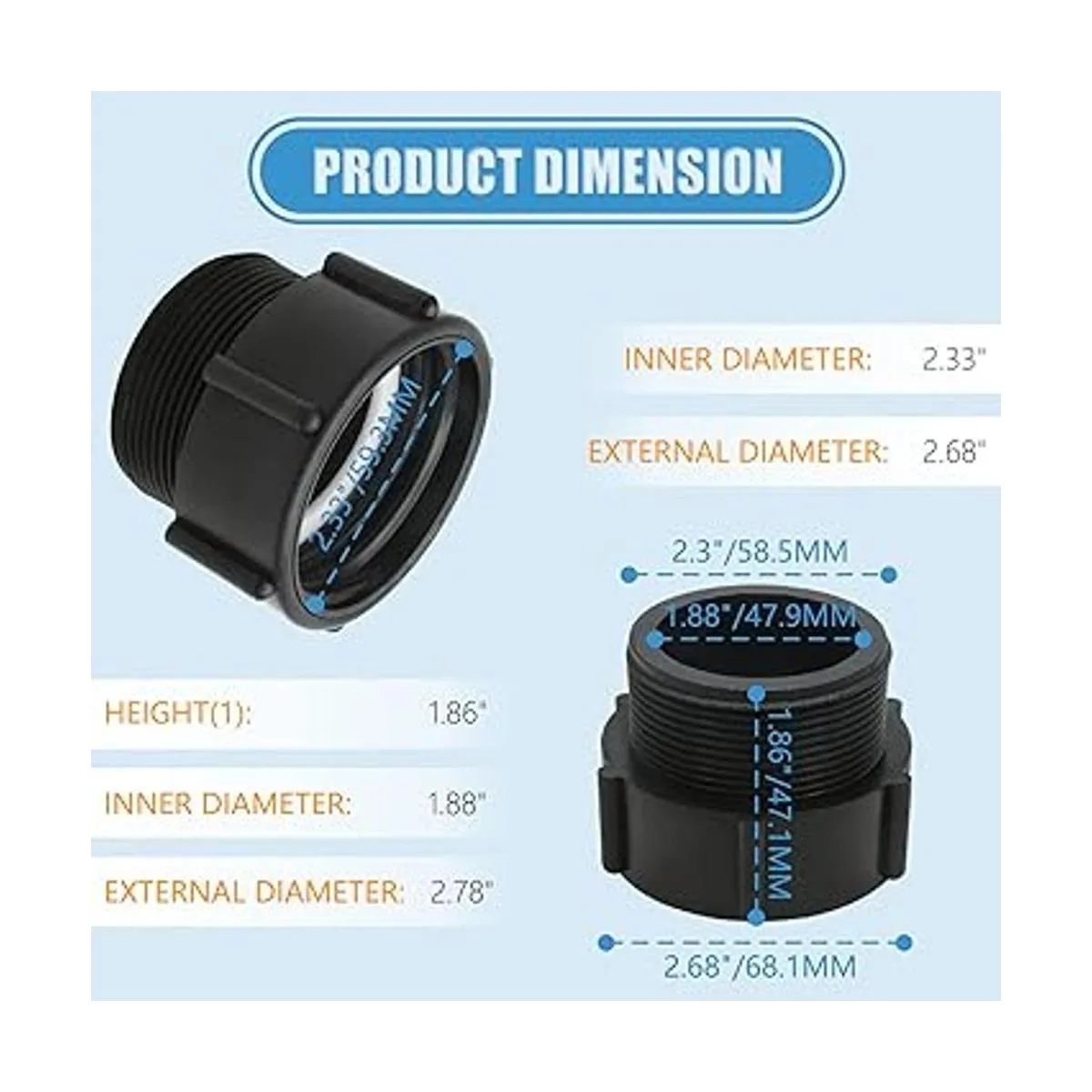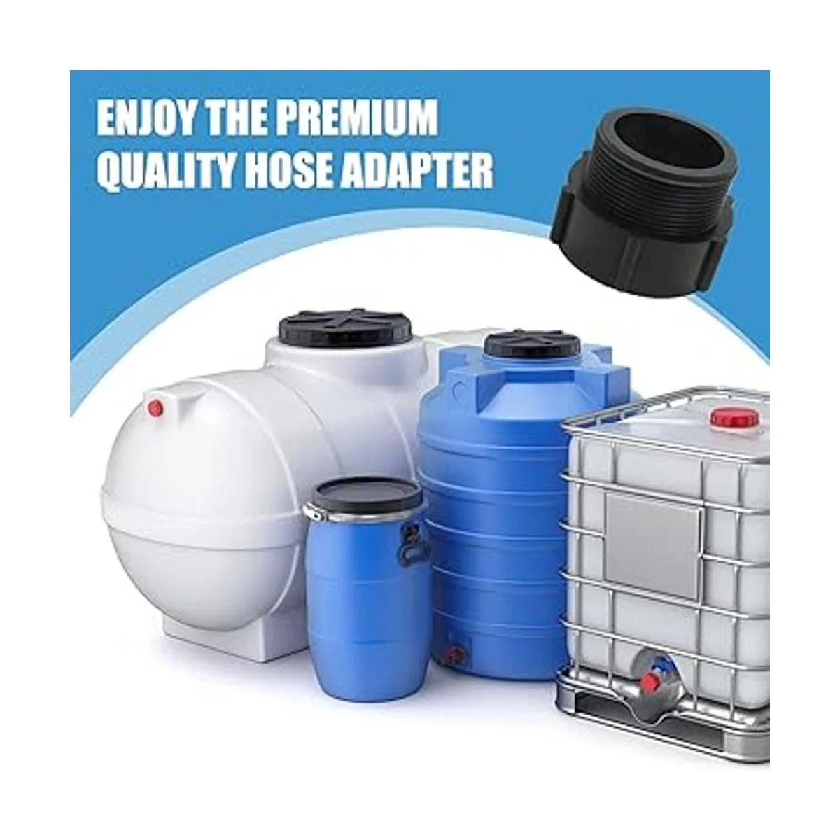 Tamaño aplicable Estos tanques IBC con una rosca S60 x 6. Aplicaciones residenciales, industriales, comerciales. Para más información detallada sobre el tamaño, consulta la imagen, comprueba las dimensiones de la bolsa IBC antes de pedir el adaptador.