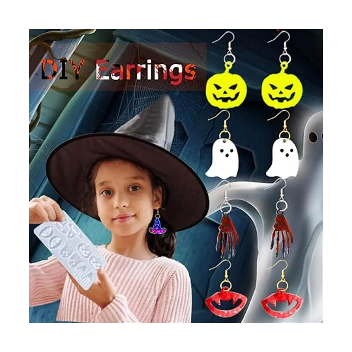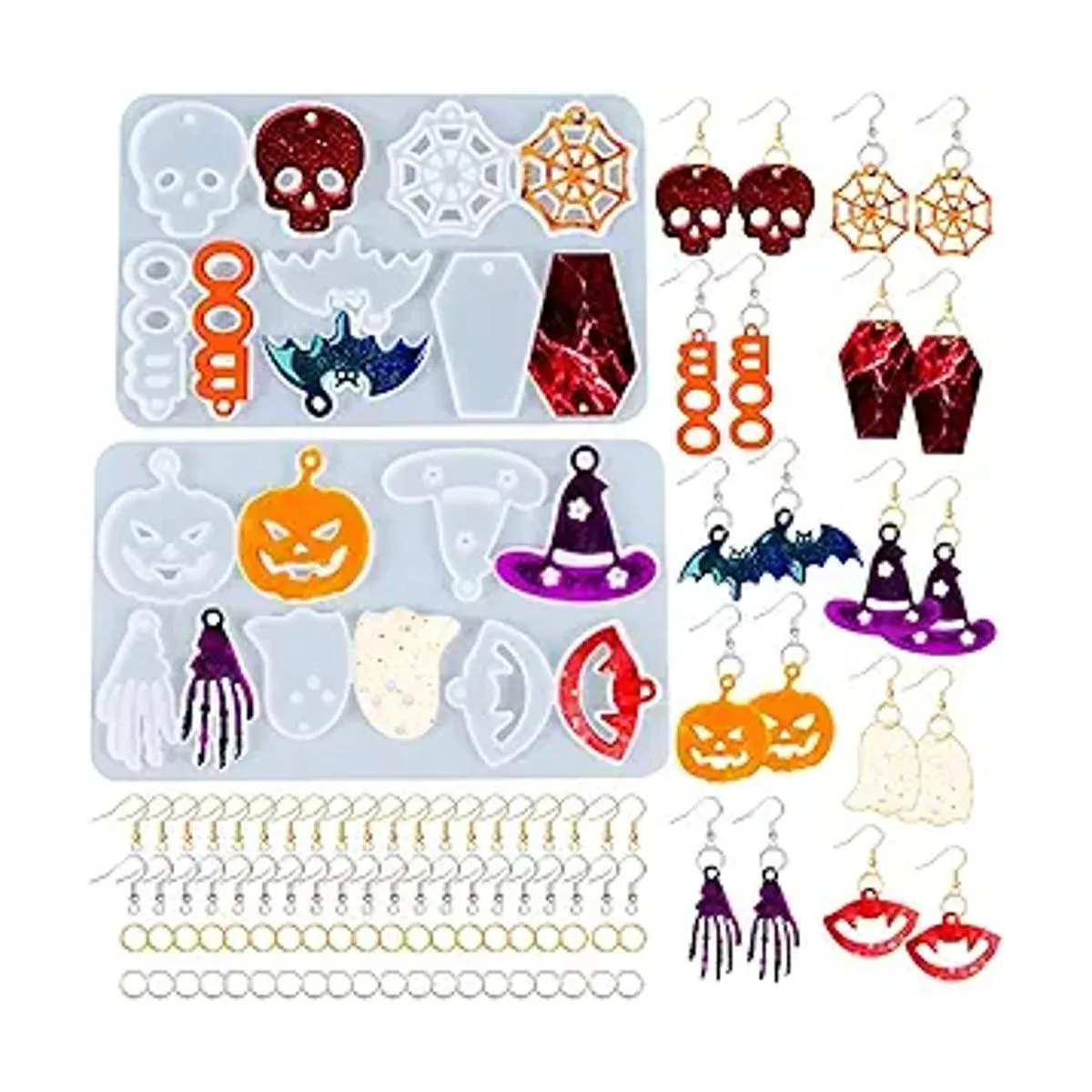 Rifanda 82 moldes de resina para aretes de Halloween con agujero, 10 pares de moldes de silicona de Halloween con 40 ganchos para aretes, calavera, calabaza, murciélago, araña, aretes de resina epoxi, molde de joyería colgante de Halloween