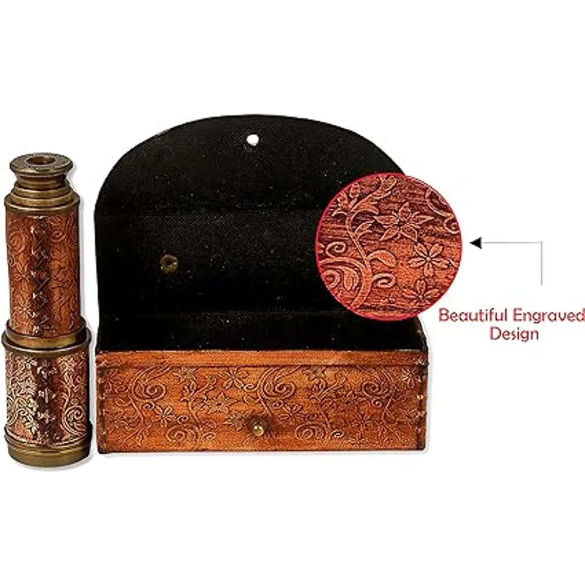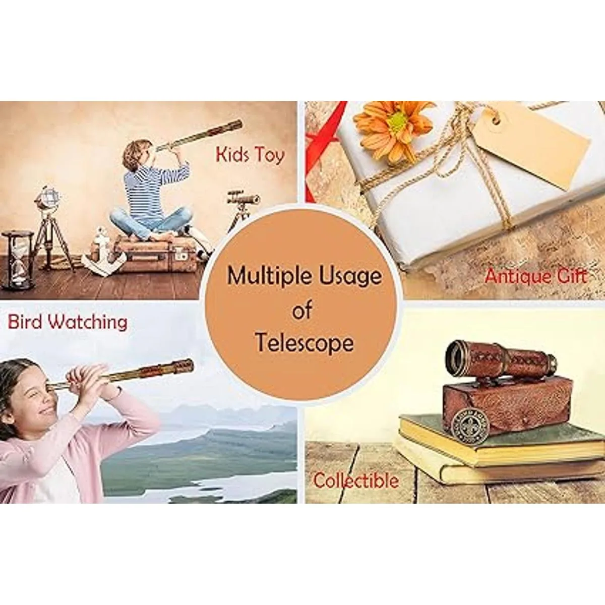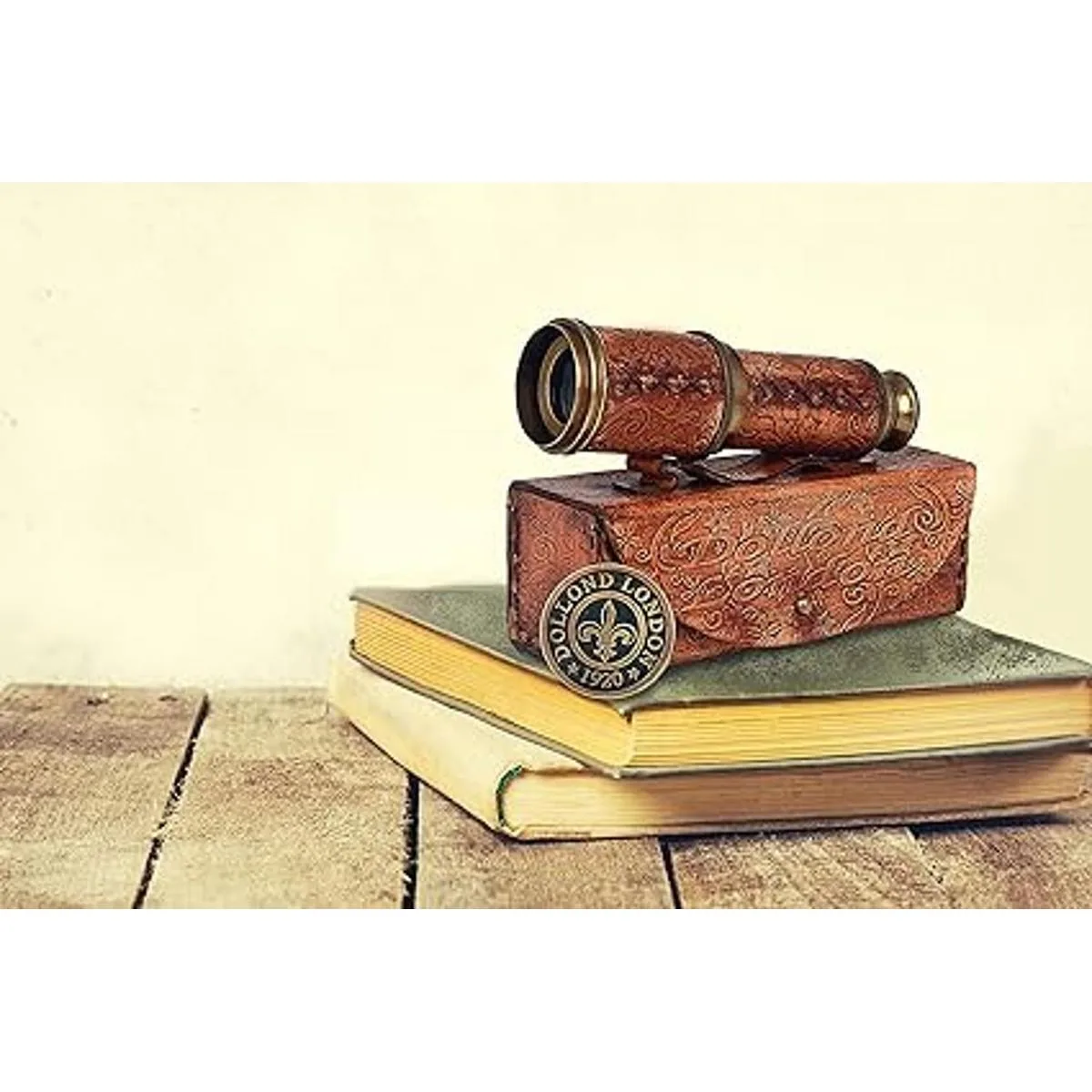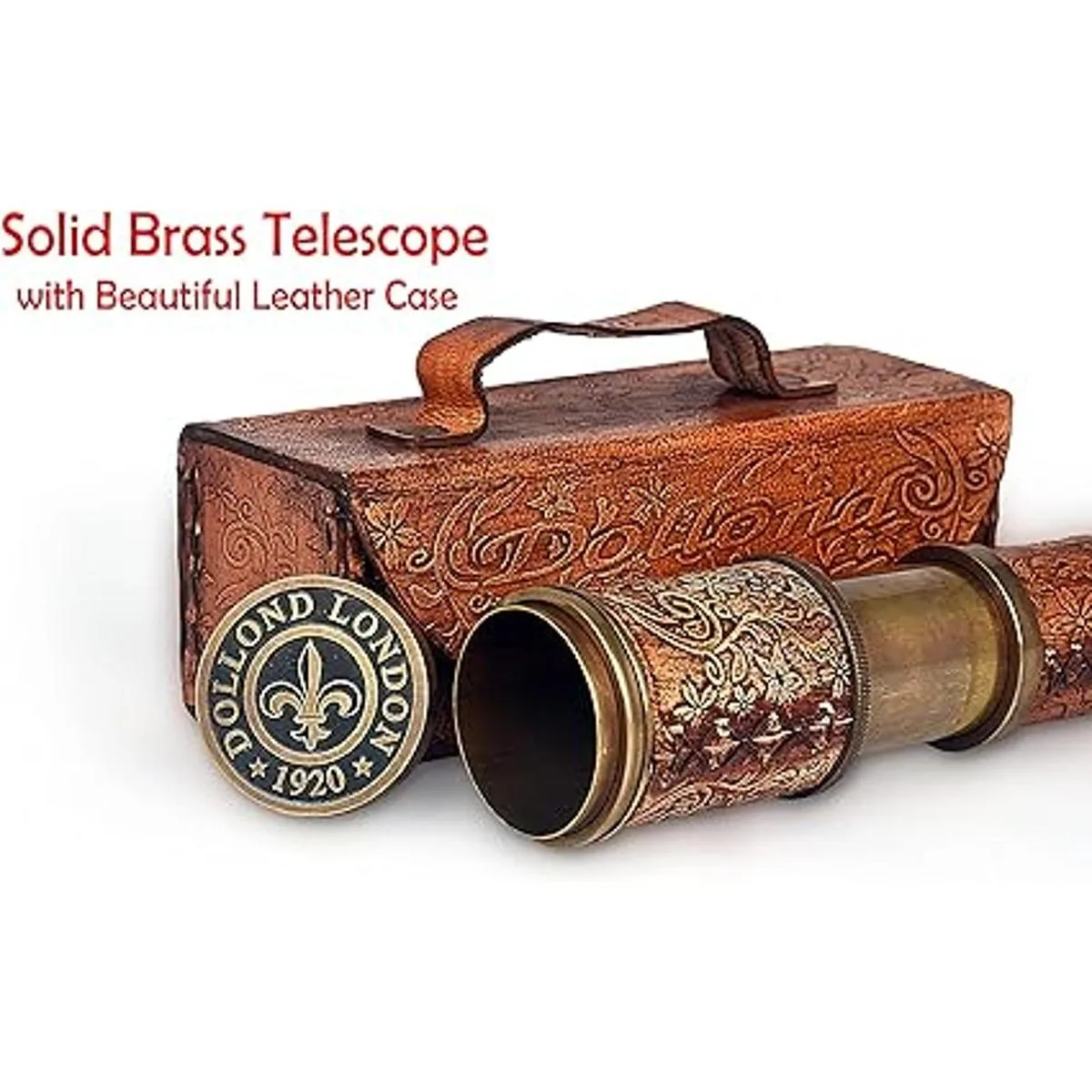 Producto de alta calidad: diseño único hecho de latón macizo con acabado de bronce brillante con funda de cuero totalmente tallada. Su acabado histórico de bronce hace que se vea real telescopio vintage. Utiliza mecanismo de empuje y tracción para enfocar objetos lejanos. Necesita sacar completamente y lentamente el barril en el interior, mientras mira a través del telescopio, hasta que el objeto deseado se vuelva claro.