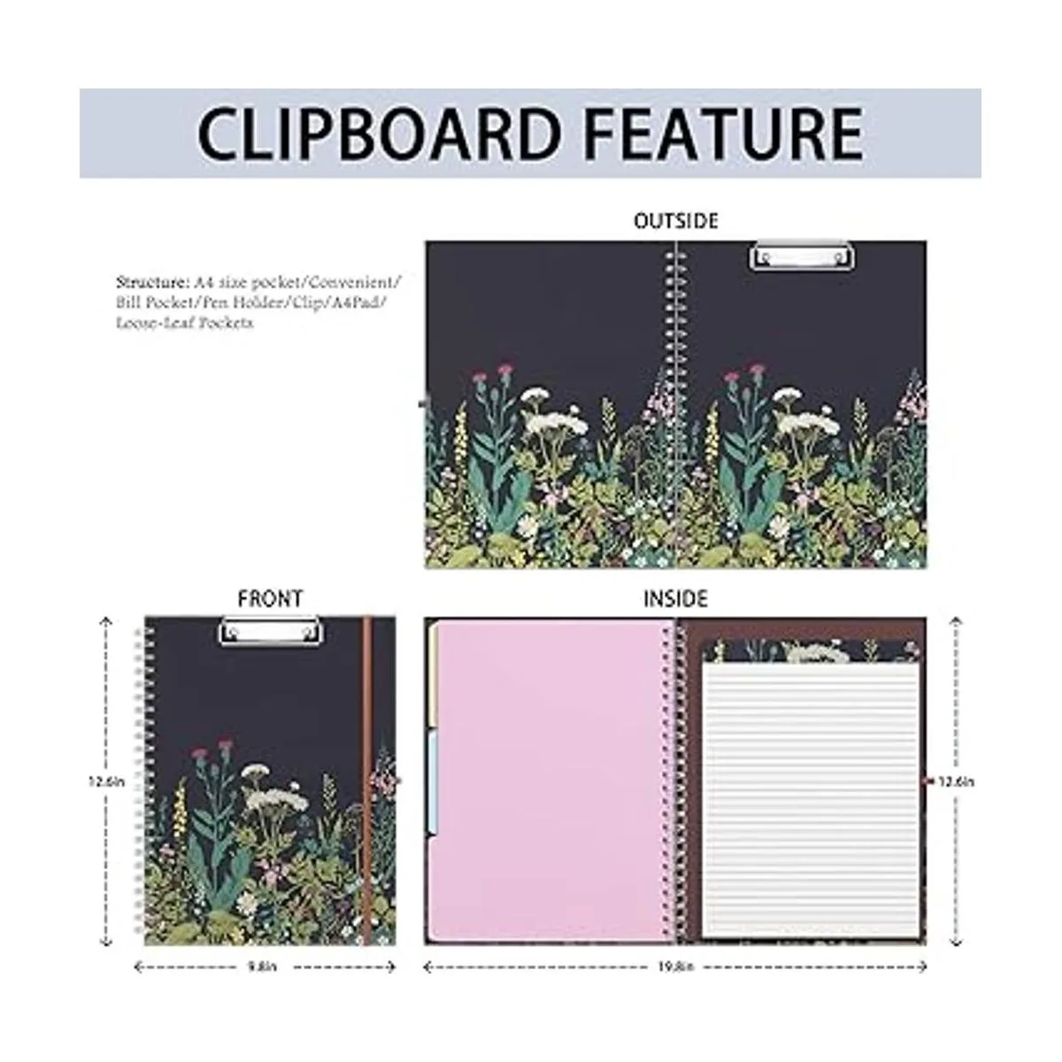 Rimilak Portapapapeles en espiral con bloc de notas forrado recargable, 14.5 x 9.8 pulgadas, portapapapeles de tapa dura con 5 bolsillos interiores, banda elástica y serie de bucle para bolígrafo. Bonito y elegante clipfolio, flor de margarita