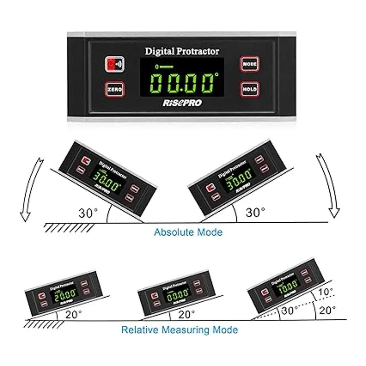 Medición absoluta y relativa: el modo de medición absoluta regular solo puede medir el ángulo contra el plano horizontal. Esta herramienta también cuenta con modo de medición relativa para medir rápidamente el ángulo entre dos superficies medidas.