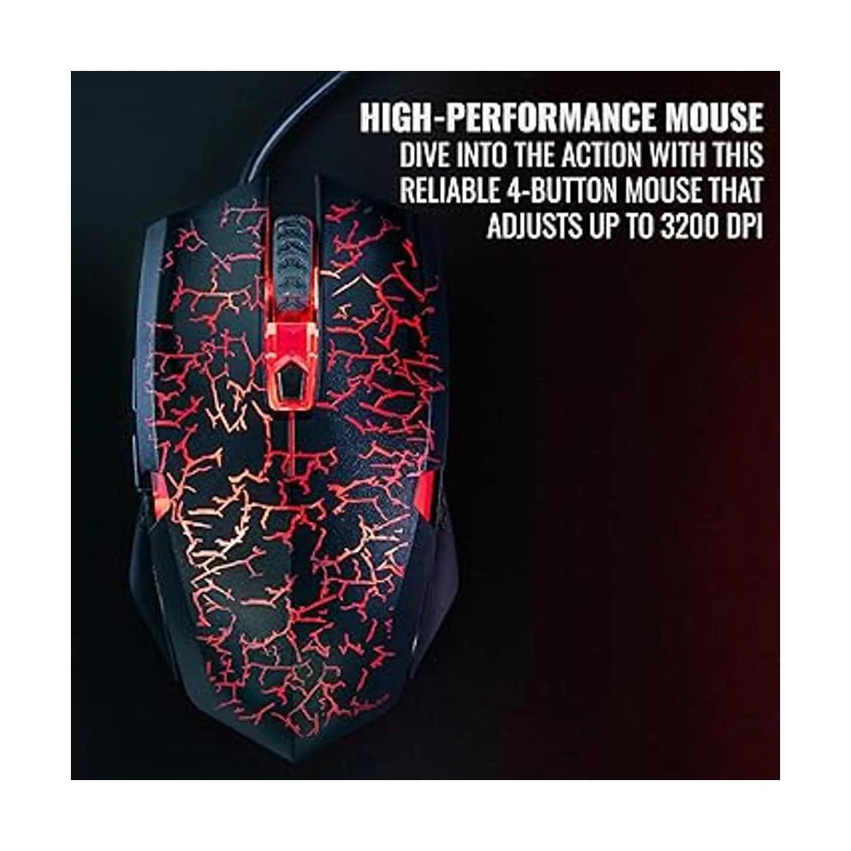 Ratón y almohadilla para juegos programables: el cómodo mouse con cable permite un movimiento rápido y preciso del cursor con patrón de pintura agrietada, 4 botones integrados, estilo ambidiestro y ajustes de DPI ajustables para adaptarse a una variedad de escenarios de juego. La alfombrilla de mouse roja con cable a juego proporciona una superficie suave y espaciosa para mouse con parte inferior agarrada y bordes duraderos