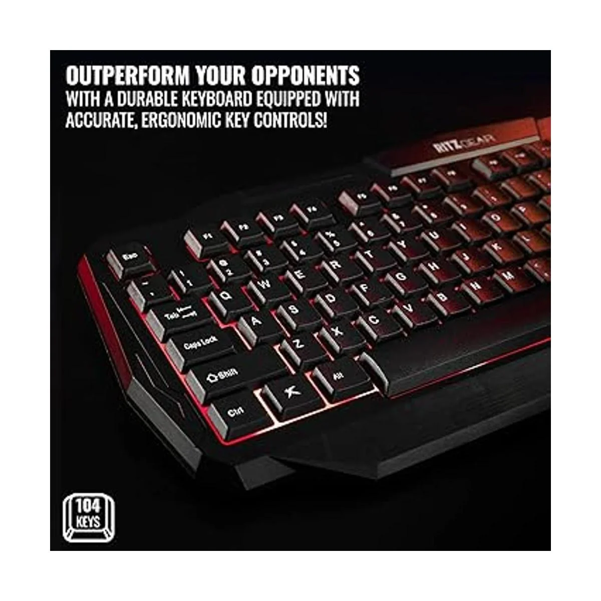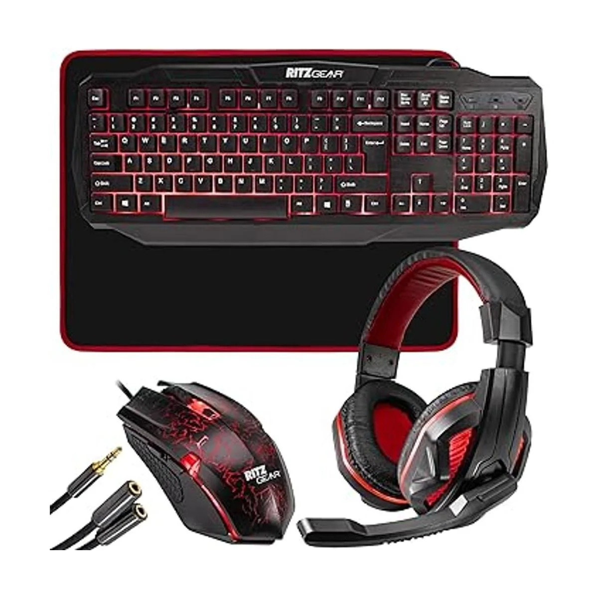 Ritz Gear Kit de accesorios para juegos rojo Paquete de retroiluminación LED 4 en 1 para PC con teclado multimedia, ratón óptico, alfombrilla de ratón y auriculares con adaptador para Windows 7 de escritorio, portátil, Xbox y PS4