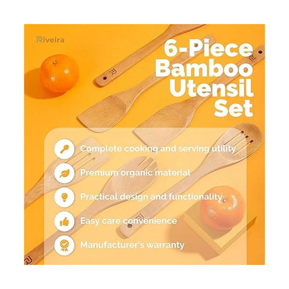 Riveira Cucharas de madera para cocinar, juego de utensilios de bambú de 6 piezas, esenciales de apartamento, espátula de madera, juego de utensilios de cocina antiadherentes, regalos de inauguración de la casa, utensilios de madera para uso diario