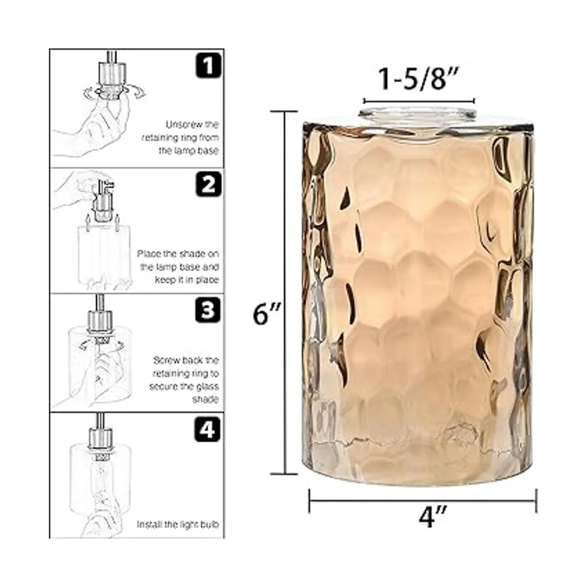 Dimensiones: paquete de 5 pantallas de cristal martillado de color ámbar para accesorios de iluminación de 1.614 in. 6 pulgadas de alto, 4 pulgadas de diámetro, nuestras pantallas de vidrio ondulado de agua son ligeramente más grandes que las normales para una instalación más fácil