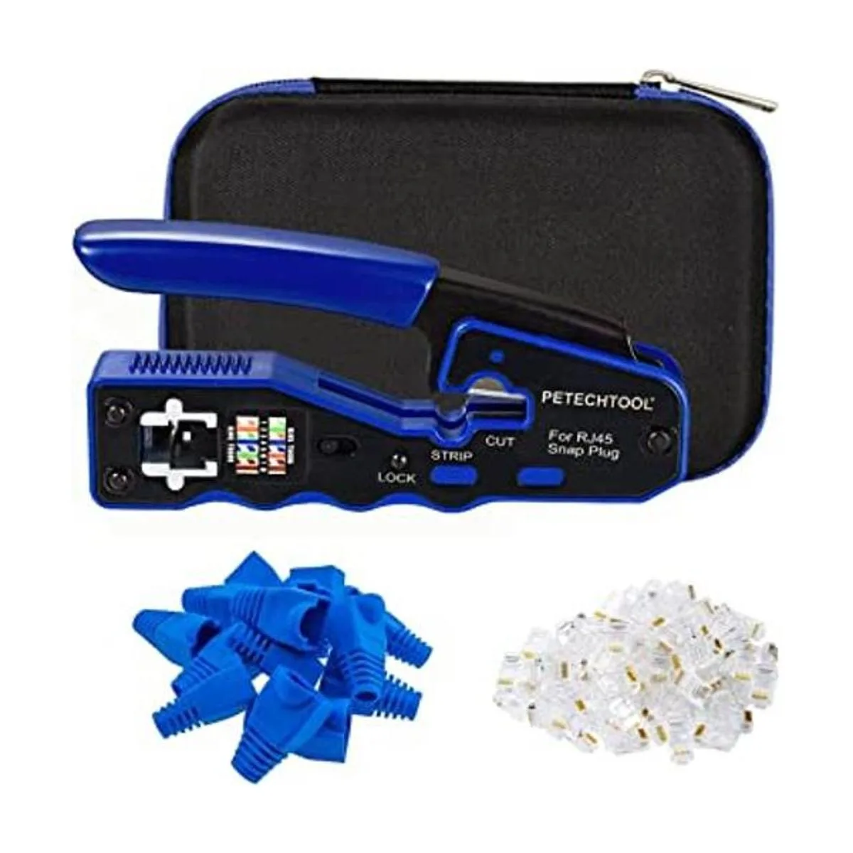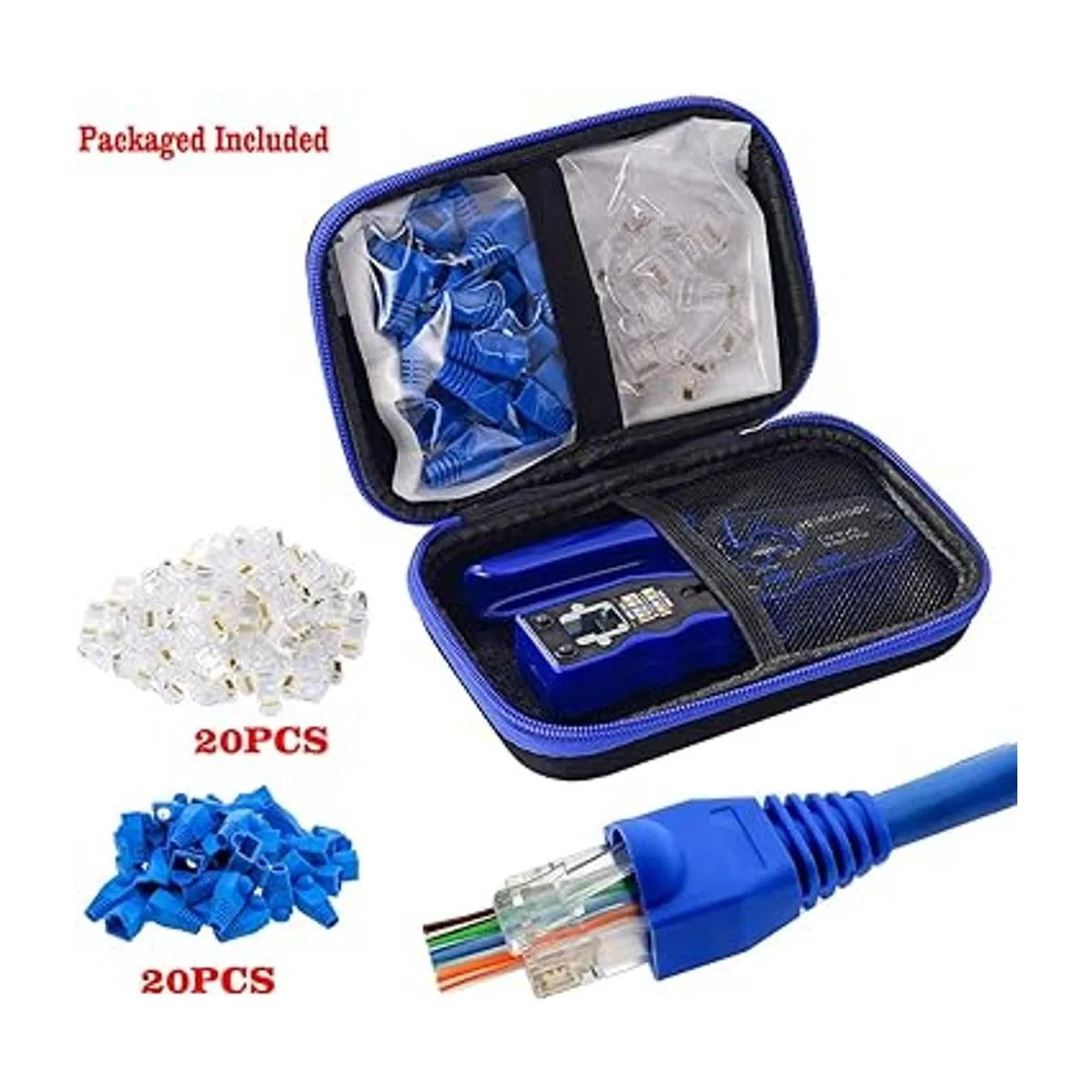 El paquete incluye: 1 herramienta de engaste RJ45, 1 funda de herramientas 20 conectores RJ45 Cat6 pasan a través de conectores 20 botas de alivio de tensión Cat6.