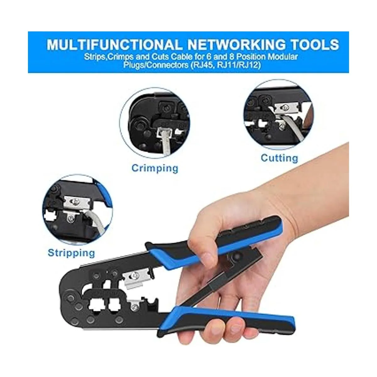 Crimpadora profesional RJ45: tiras, corta y engarza cable para conectores modulares de 6 y 8 posiciones RJ45, RJ11/RJ12.